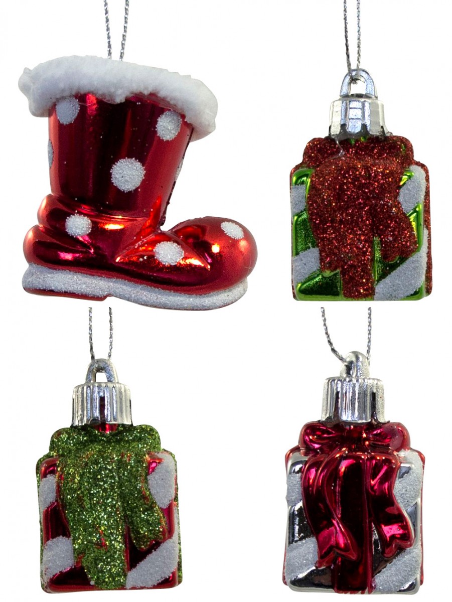 Have fun decoration your tree without spending a lot of time shopping for decorations. The primary bonus of buying a pack of coordinating decorations is that you do not have to spend as much time shopping. You then have more time to spend decorating your tree with your family. The classic Christmas colours of these presents and boots allow them to blend in with your other decorations. You can have the traditional look you want for your tree with this pack of glass like ornaments.