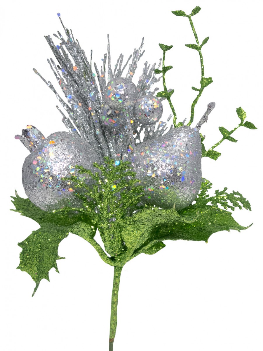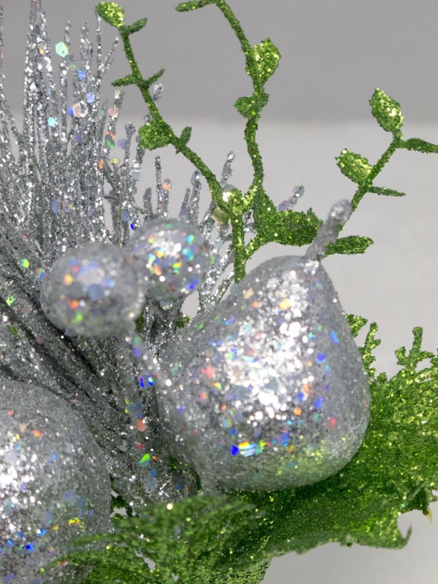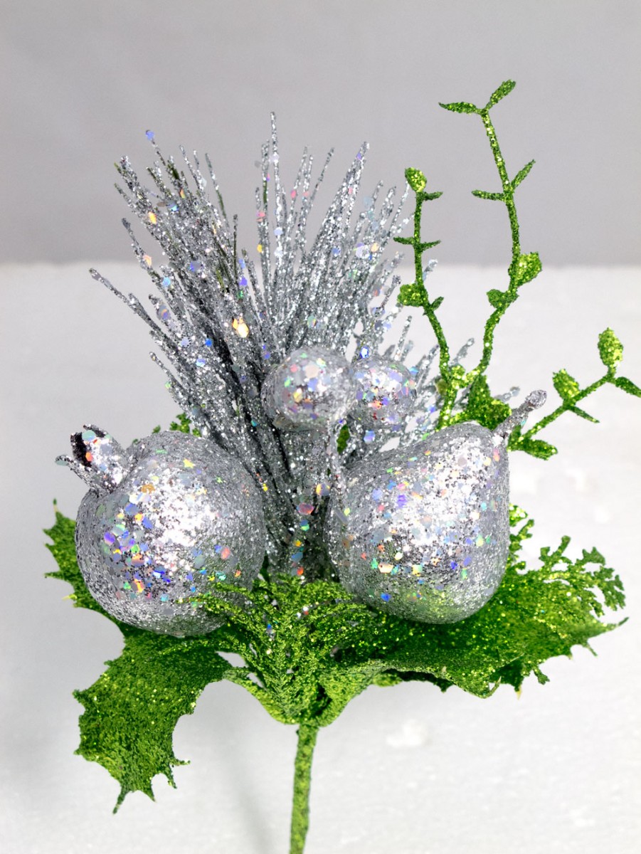 What better way to create that vibe this Christmas with the Assorted Silver Glittered Fruit Decorative Pick. It is made of silver and green glittered foliage and silver glitter. It is easy to fasten with its alligator clip. For the best effect, buy in sets more than 1