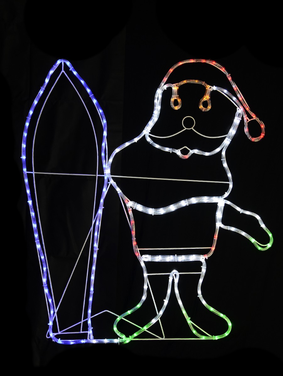 This ready to surf Santa Claus stands about 94cm tall and 1m wide and is a perfect way to show your guests or neighbours your love for surfing and the holidays. You can hang it in the living room, hall, near the entrance or put it up at large bushes and hedges on lawns and gardens. Set the LED light bulbs in the clear rope tube to the static mode or choose a nice flashing speed to brighten up your Christmas decor this holiday season. This fun display is mains operated and with a lead wire that has a sufficient length of 3m to make it easy to install both indoors and outdoors. Our product complies with Australian safety and performance requirements. Sold individually.