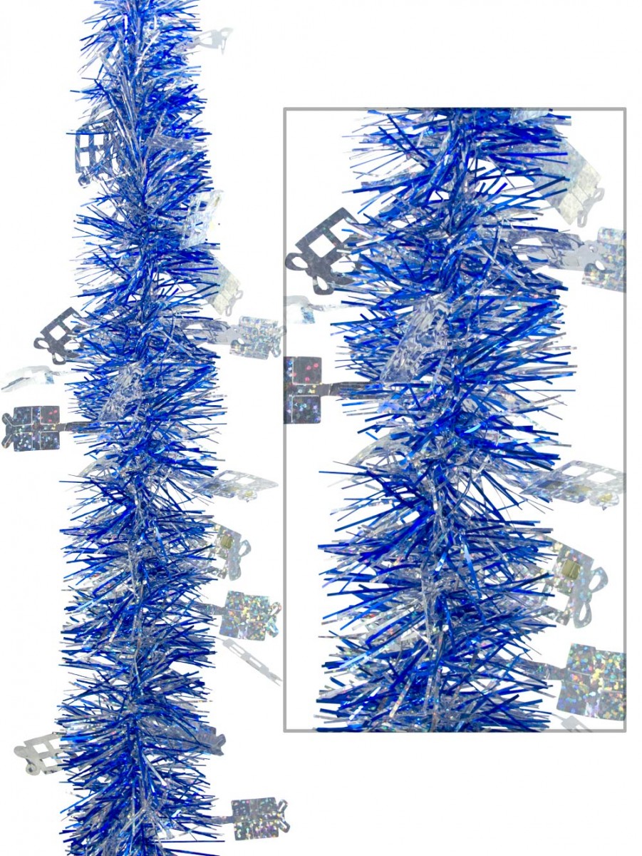You can never have enough glitter and sparkle when you decorate for the holidays! Deck your halls with some fabulous tinsel to get you in the holiday mood. Wrap it around the tree, outline doors and windows, wrap it around a post, use it to make your own wreath, bring it to the office to add a bit of cheer...the possibilities are endless! Two metres of blue and silver fine needle tinsel garland features tiny iridescent silver gift boxes. Buy one package, or multiples if you want to really bring the shine this Christmas! Dimensions are 2 m x 20 cm x 4 ply.