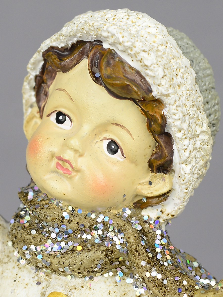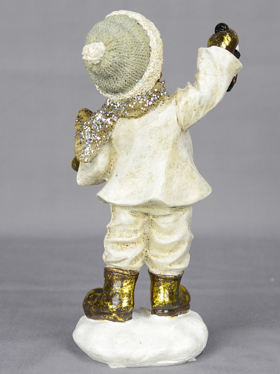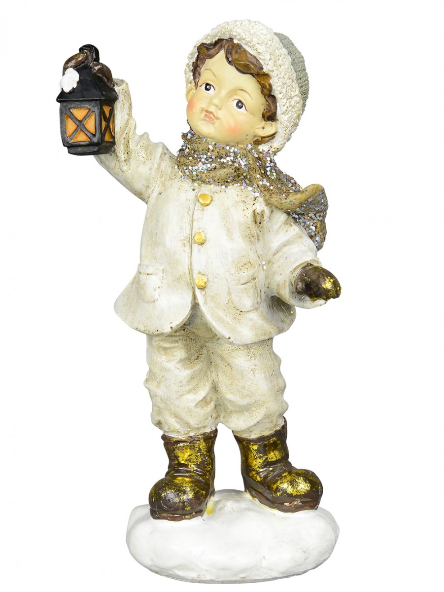 Boy is in ivory wearing a sequin scarf, knitted look beanie, brown gloves & boots dusted in gold & lantern is black with orange glow look