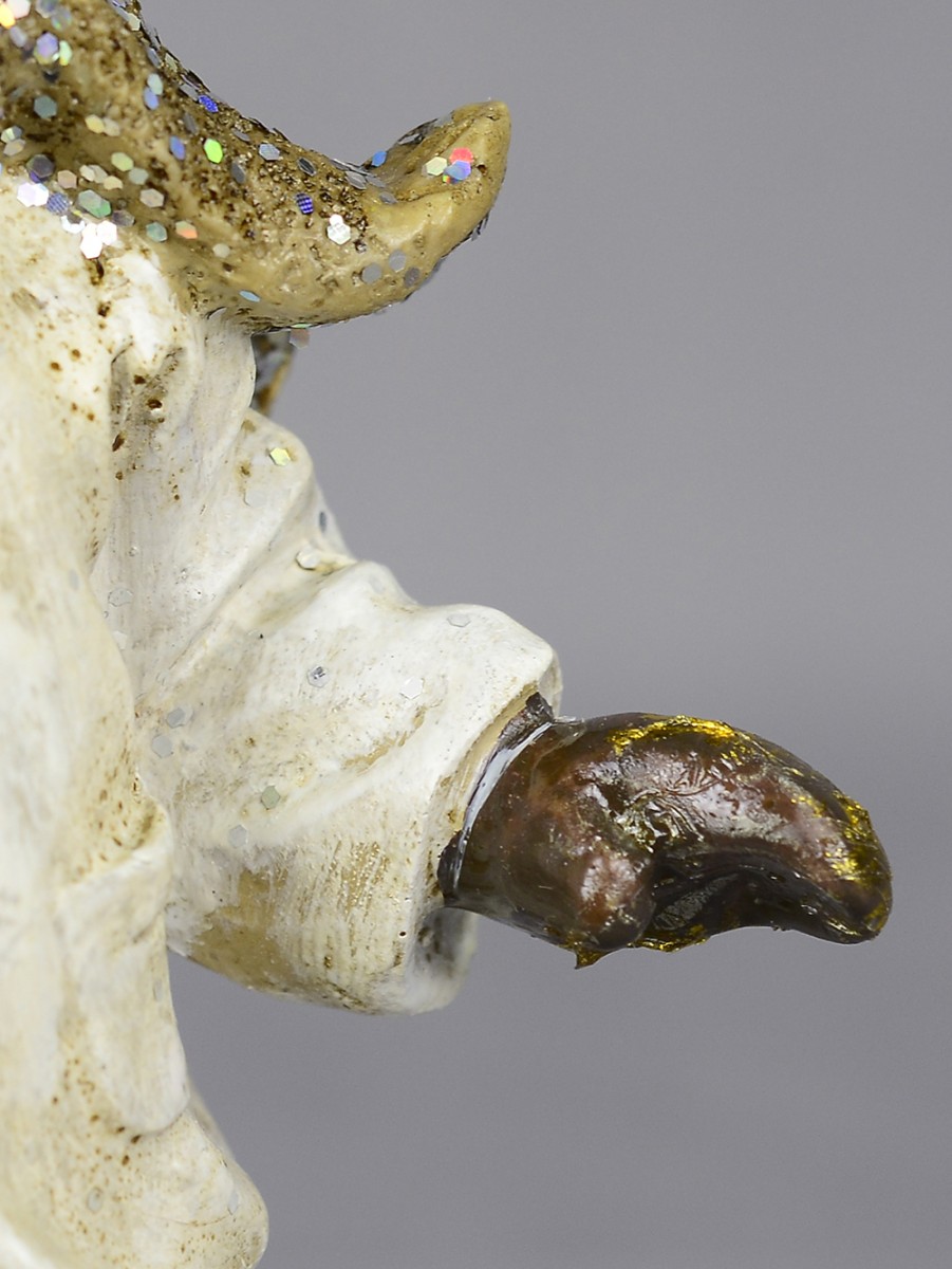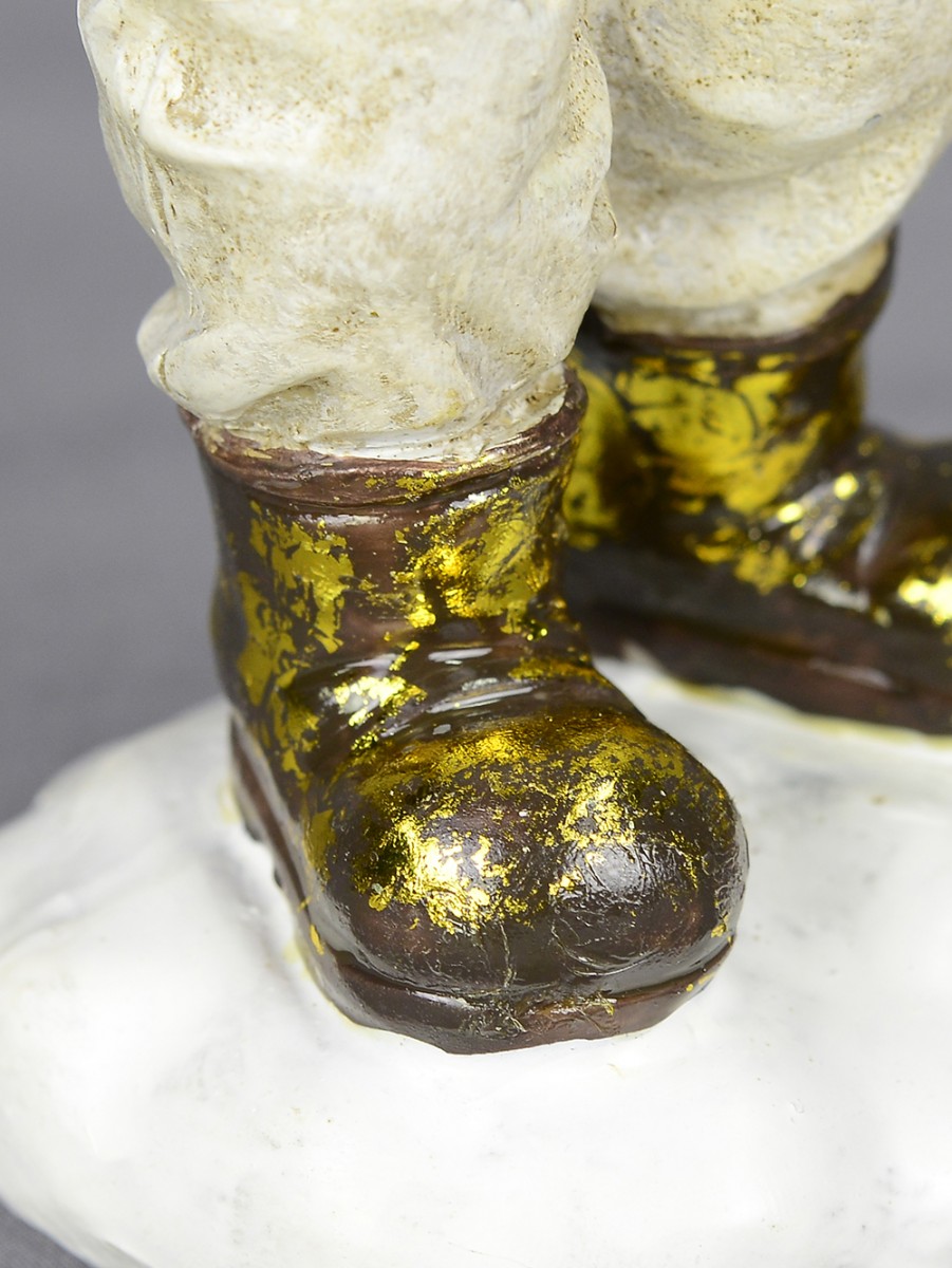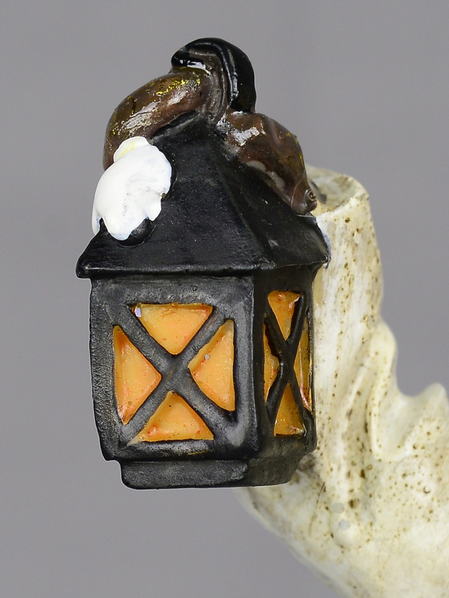 Boy is in ivory wearing a sequin scarf, knitted look beanie, brown gloves & boots dusted in gold & lantern is black with orange glow look