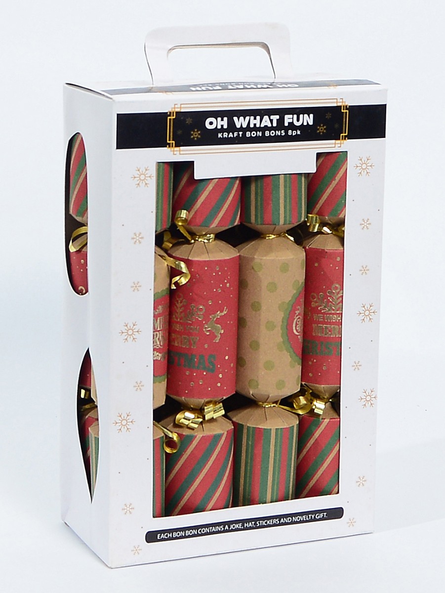 Each Christmas cracker includes a snap, toy, stickers, hat & joke