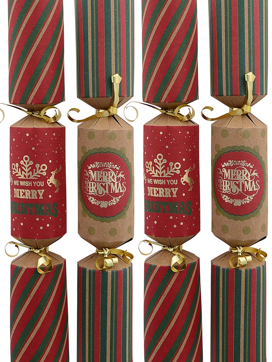 Brown, red & green kraft bon bons with gold Christmas logo pattern design