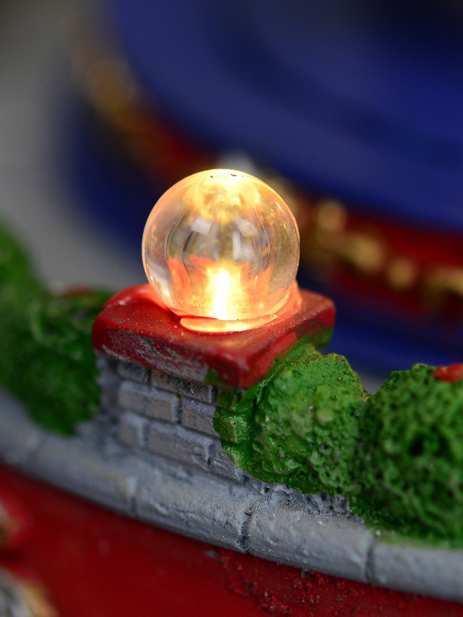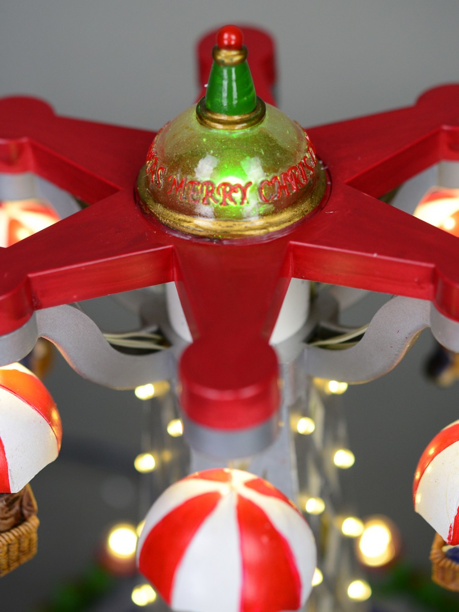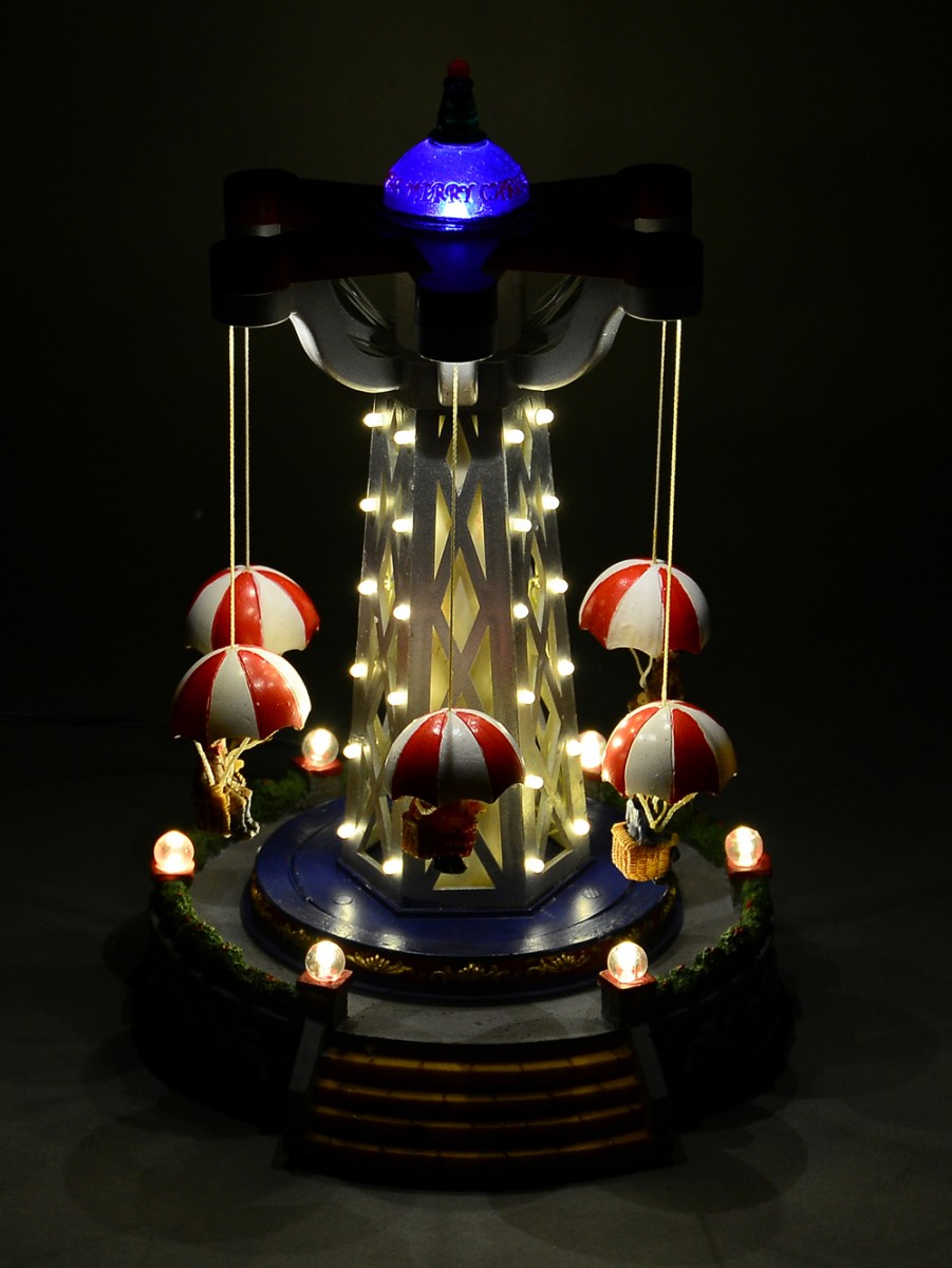 Add some fun to your Christmas village display with this carnival ride scene! The swinging ride features suspended parachute looking seats - each with a figurine. Ride moves in circular motion with music adding additional detailing. The inner stem of the ride has small LED lights in warm white to light up the ride - with additional lights around the base of the scene. A lovely multi colour LED light on the top finishes this scene off perfectly