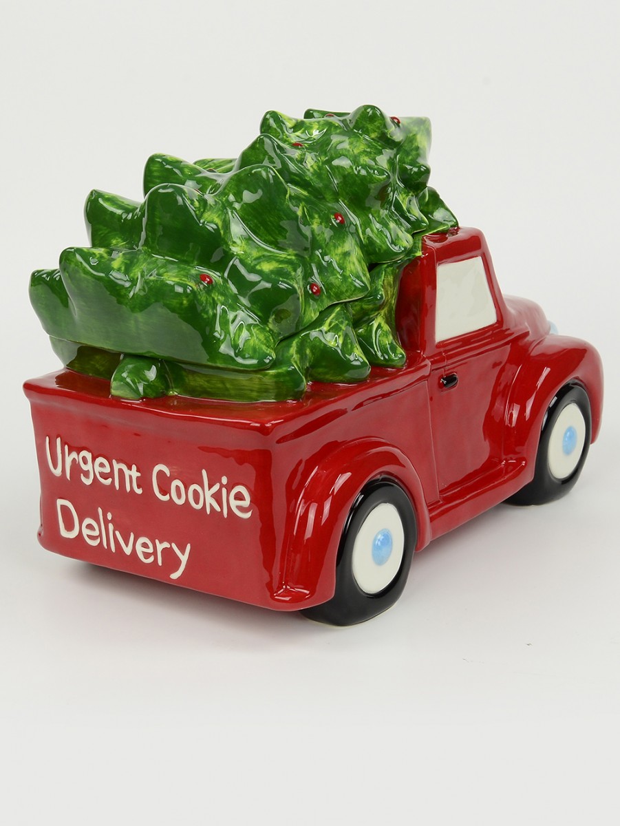 Apart from a fun tabletop decoration, this also serves as an 'Urgent Cookie Delivery' cookie jar with the green Christmas tree lid at the back of the truck that can be opened and closed for adding in cookies, nuts, candies, biscuits, lollies and whatnots! This toy jar features a bright red truck with a cut Christmas tree on the back decorated with red baubles. Front of the truck is decorated with a green bow wreath. Place it on a table or mantle to complete your holiday decor.
