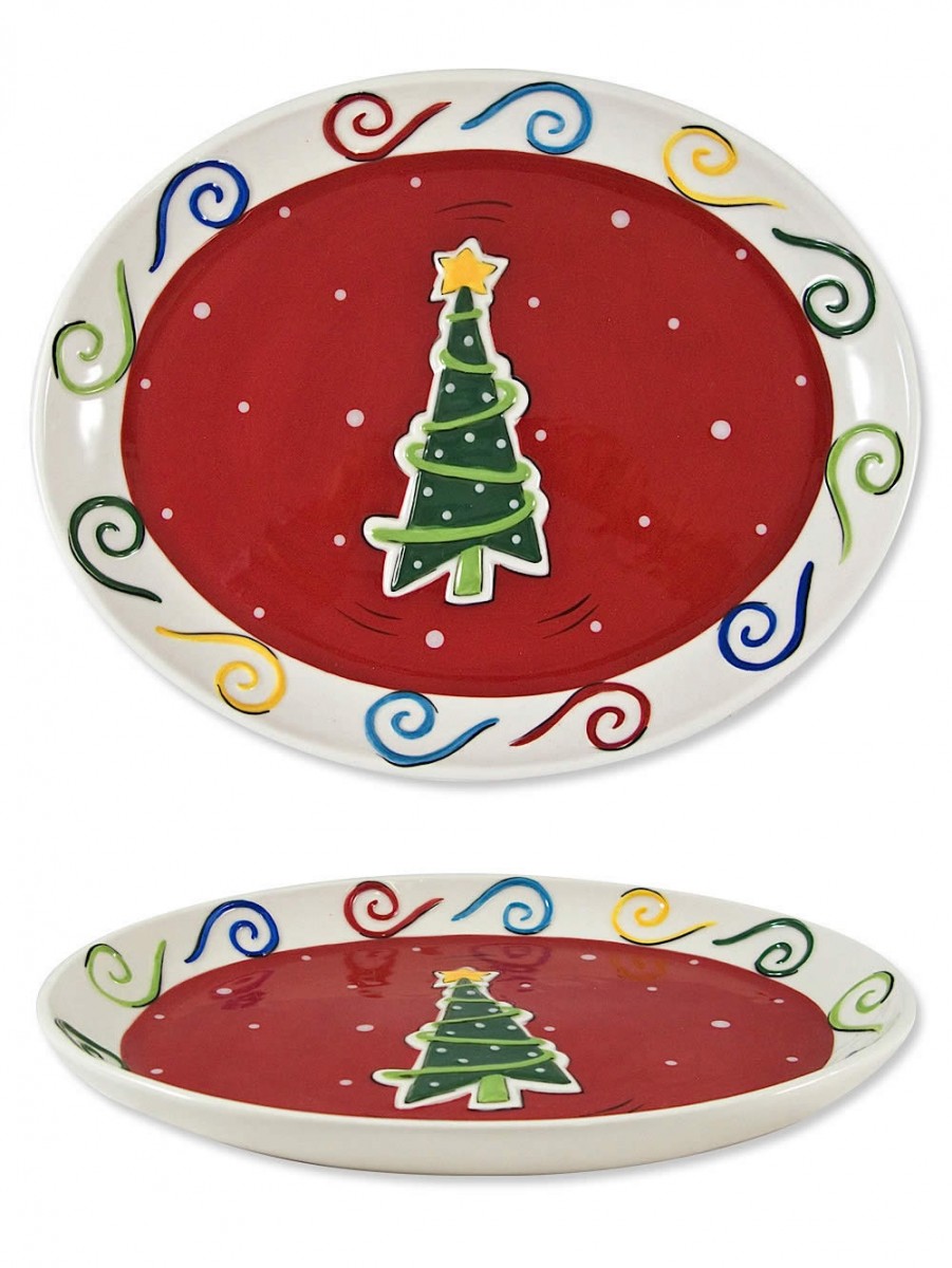 This ceramic oval plate with a Christmas tree design is a circular display of a green Christmas tree on a red background that you can serve holiday meals on. A swirly pattern of curly cues around the rim and the tree make this oval plate truly special.