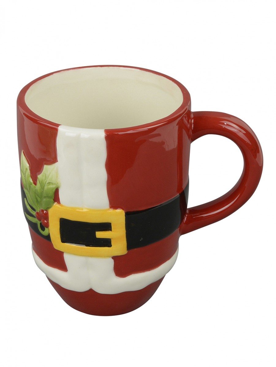 Enjoy your favourite brew in this adorable Santa suit coffee cup that features a cute Santa suit with fur trim and a holly tucked in the yellow buckle of the black belt. It will be a whimsical holiday accent to both decorative and functional surroundings and will make those comforting, warming sips of coffee or hot chocolate even more enjoyable!