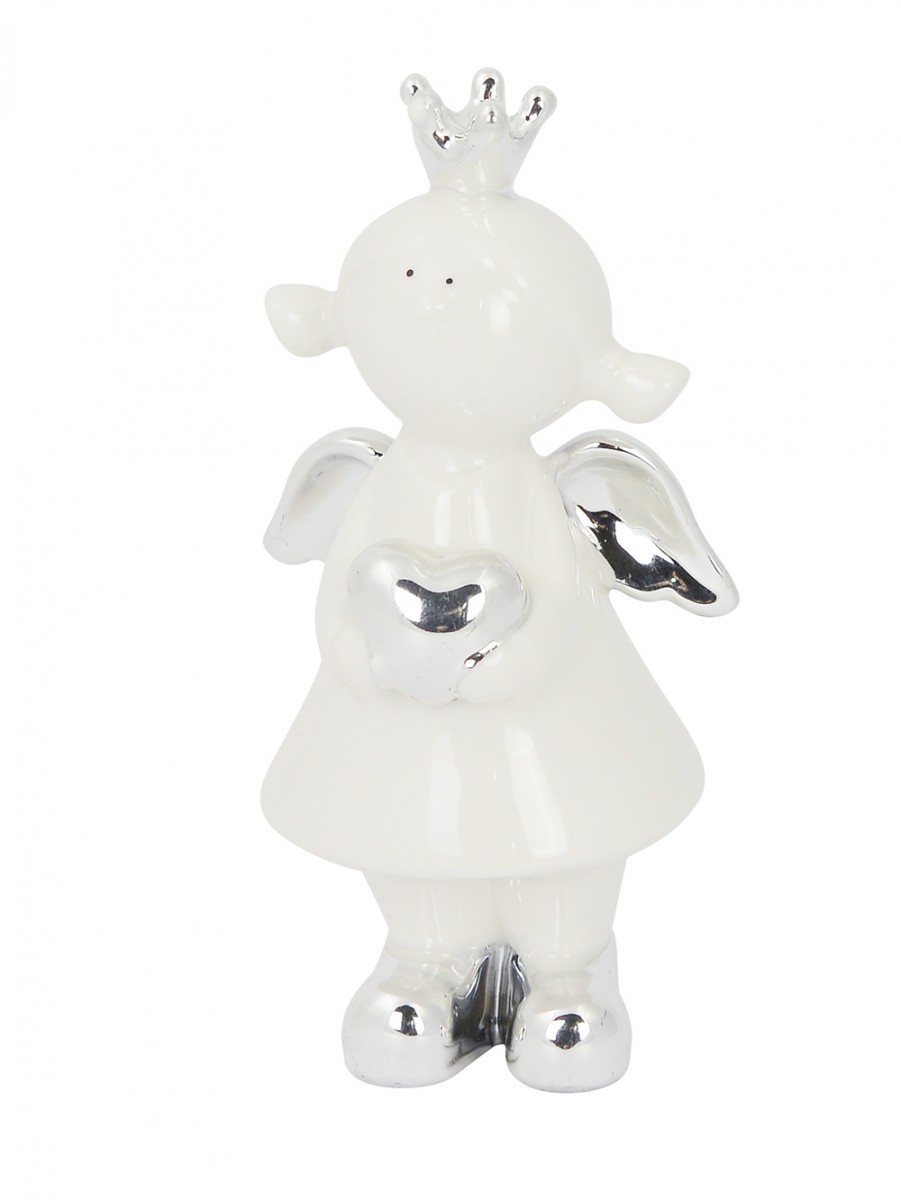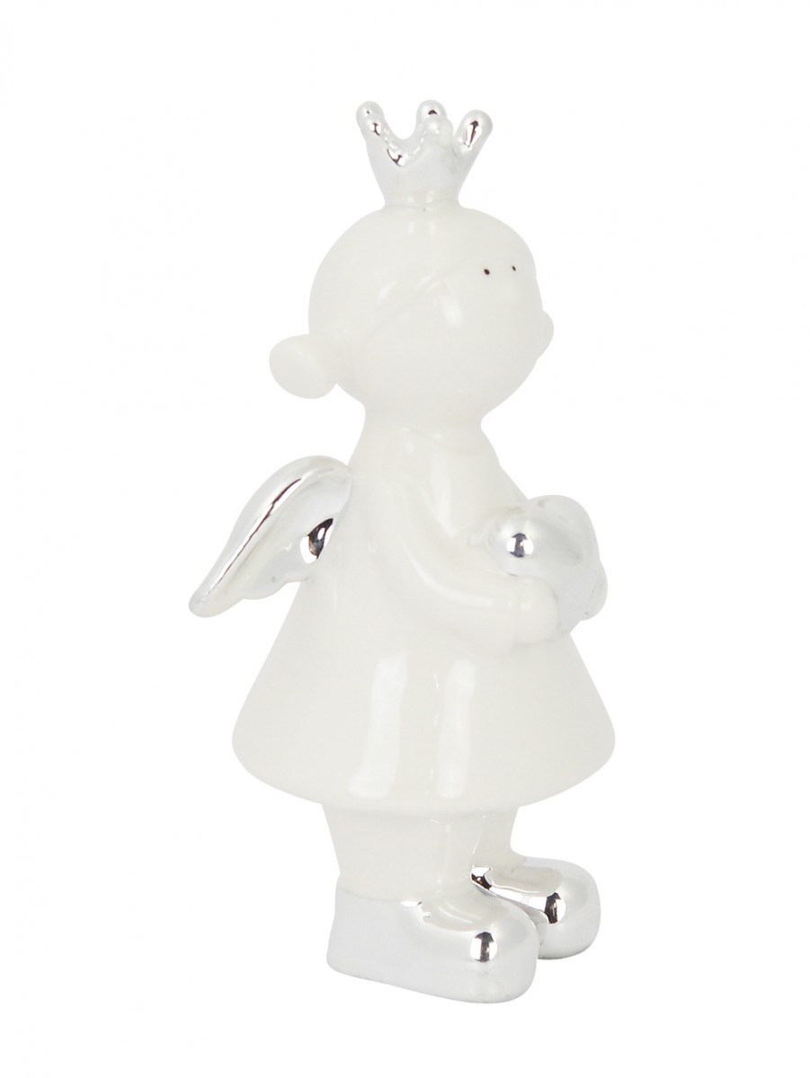 In the form of a cute girl, this angel standing ornament has a peaceful look and is sure to sprinkle some blessings on you and your loved ones every day. Made of white ceramic, this endearing freestanding angel with silver crown, boots and wings, holding a silver heart will make a lovely addition to your mantelpiece, centre of the dining table, coffee tables, buffets, and counters or just about anywhere you wish!