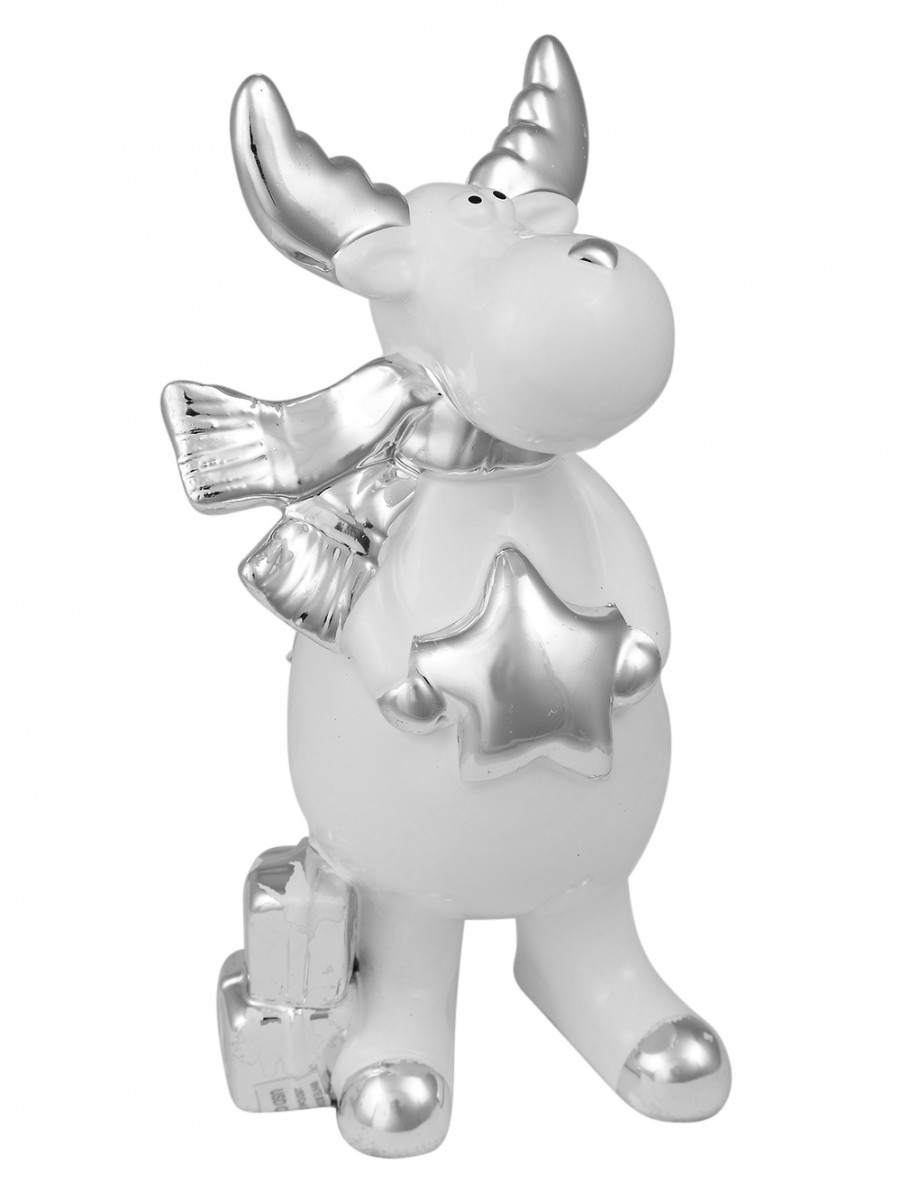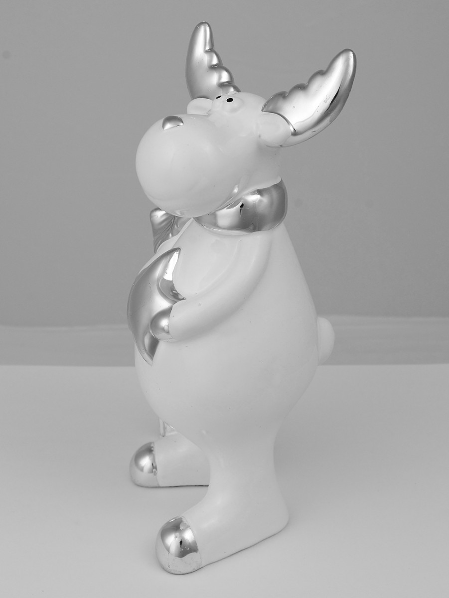 Good for decorative use, our white Ceramic Standing Reindeer with silver accents will be a nice contrast against typical seasonal coloured backgrounds. This well-made ornament features a merry standing ceramic reindeer with shiny silver antlers and scarf holding a silver star in his hands with silver presents next to his right leg.