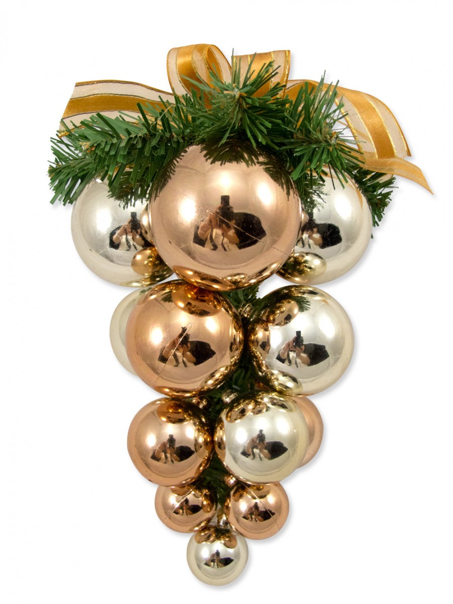 Although Christmas ornaments are typically used on a tree, there are so many more ways to use them around your home. You can use them to create garland or just put them wherever a bright touch of Christmas cheer is needed. This Pre-Decorated Bauble Cluster decor allows you to display ornaments in a whole different way. Champagne and copper round ornaments in a variety of sizes and with a metallic finish are formed into a grape cluster with green faux pine branches attached above and a gold bow tied at the top. Whether you use a ribbon or a hook, this item is easy to hang and would look lovely over a doorway, above a mantle or even used as part of a centerpiece. It comes already assembled, so all you have to do is remove it from the packaging and place it wherever you wish. With an item this beautiful, you'll want to put them everywhere!