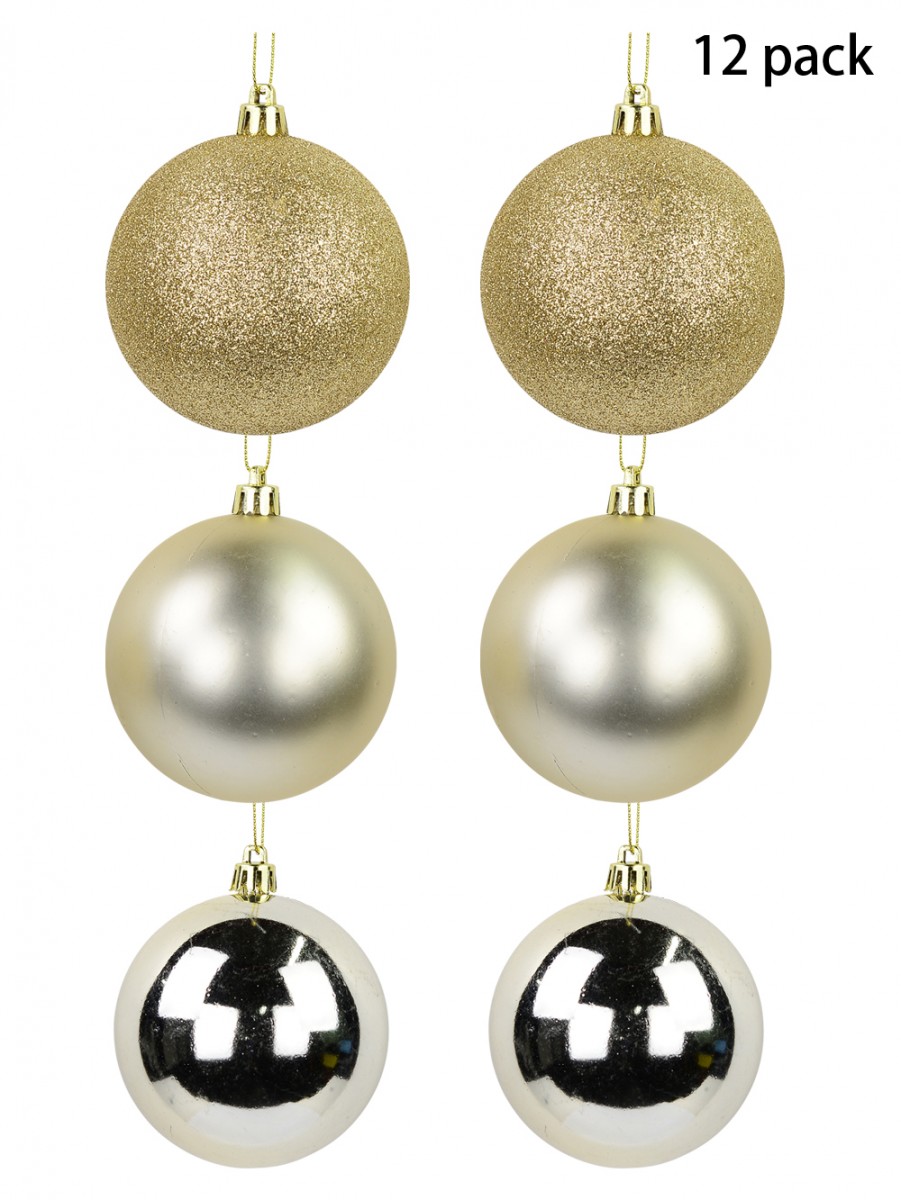 Look forward to decorating your Christmas tree this year with this iconic-coloured embellishment set containing twelve baubles that are a welcome change from the usual gold themed packs. Per order you will get four champagne glittered baubles, four champagne gloss and four soft champagne pearl baubles that come with thin gold strings attached ready to hang wherever you please.
