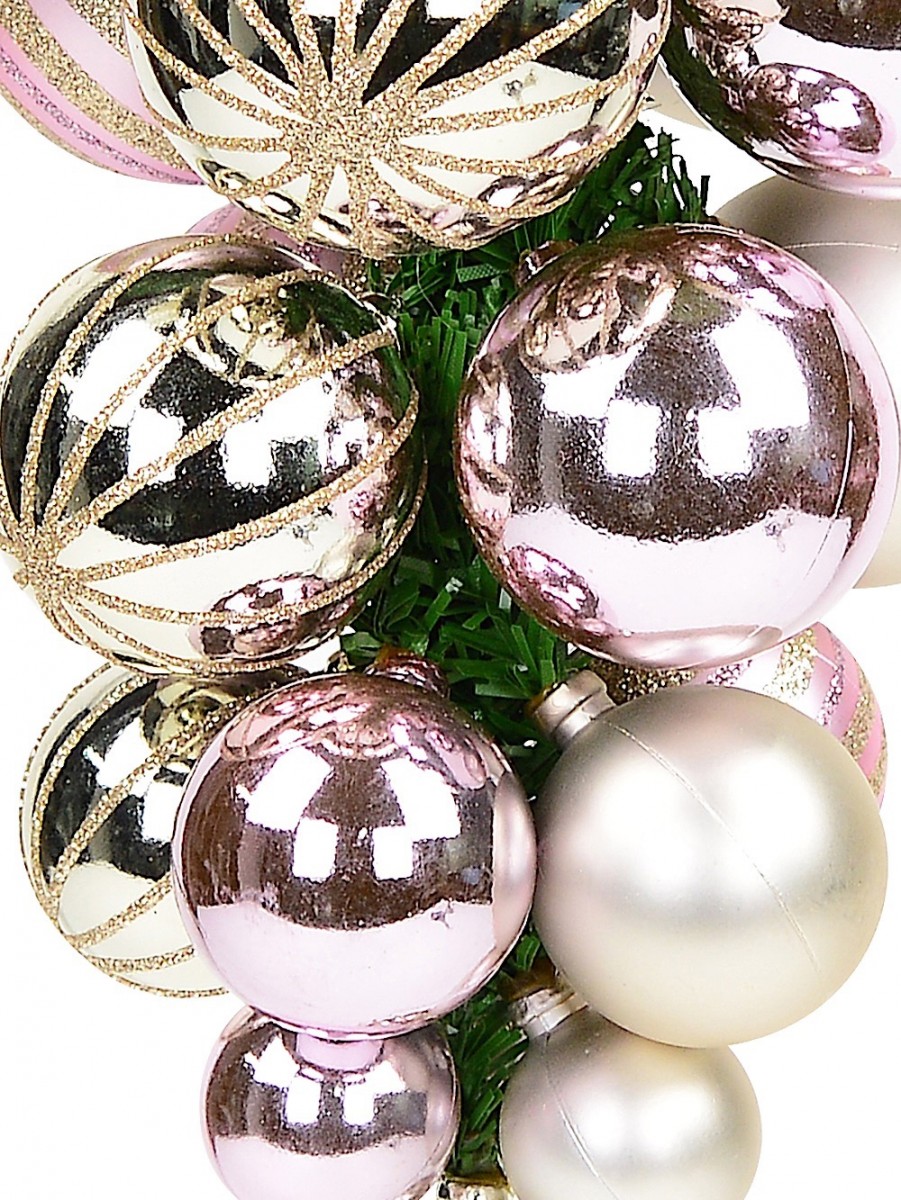 The mesh ribbon also completes its look with a beautiful bow, its tails draping over this collection of classic ball ornaments. It features different sizes of metallic and glossy pink baubles, some decorated with thin gold glitter lines along with glossy and matte champagne baubles. These together form a wonderful grape-shaped ornament that will bring a nostalgic feeling to your home. These decorative spheres give the luxe look of glass and because of their whimsical composition and feminine colour, they are sure to steal the show! They can even be used in your Christmas bridal shower decoration and seasonal celebrations.