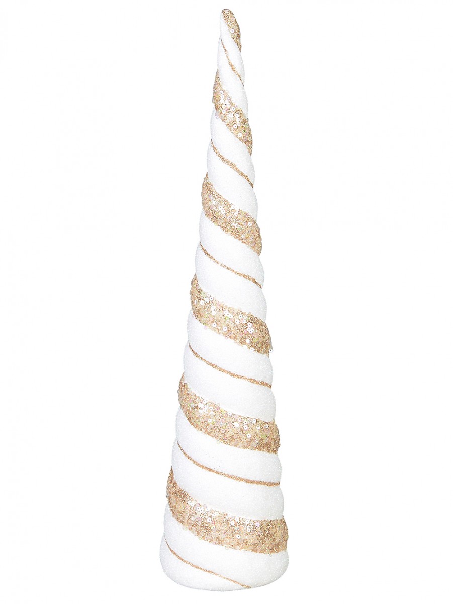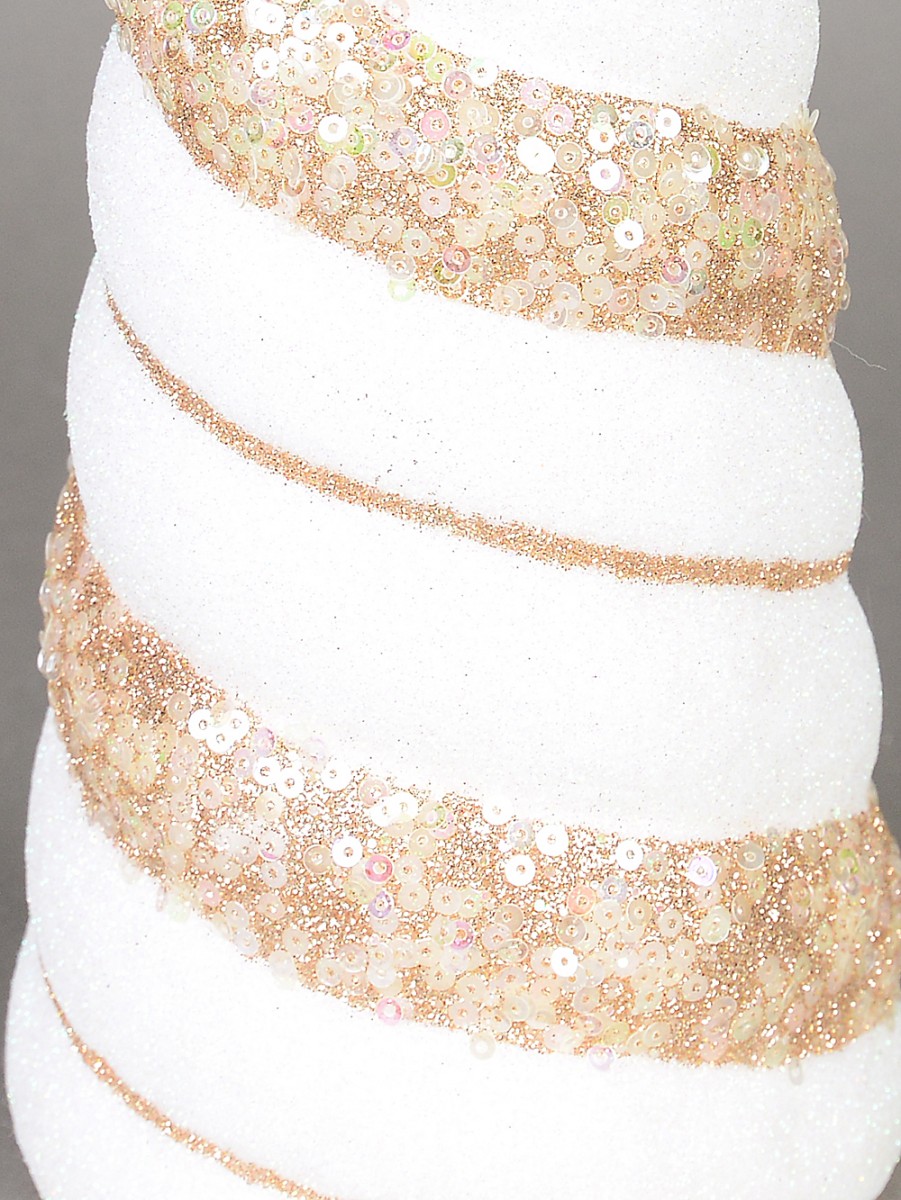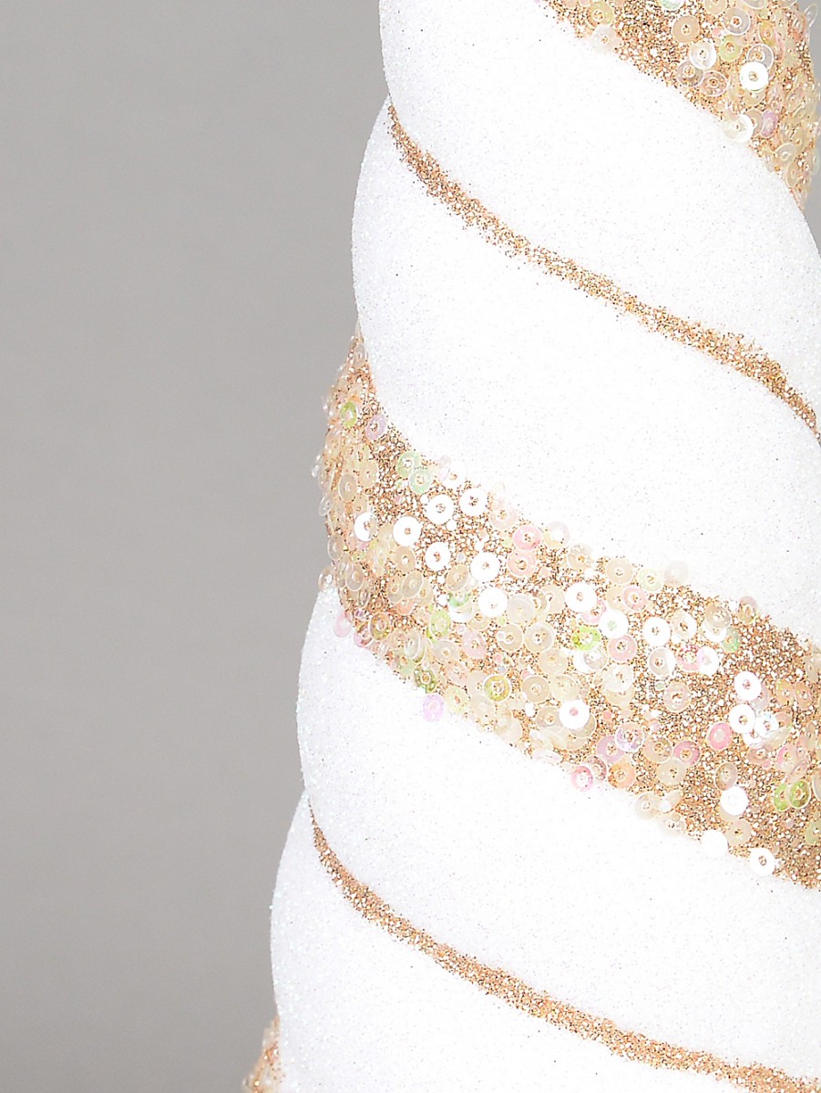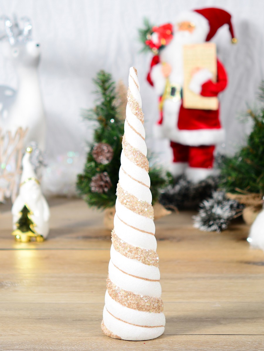 Sold individually at a festive discounted price, you should buy as many of this Champagne & White With Glitter & Sequins Conical Shape Table Top Tree as you can while it is still in stock. This is because this faux Christmas tree has an exceptional decorative appeal that would blend in perfectly with every Christmas decorative theme you may be planning for this forthcoming Xmas. This spiral diagonally striped pattern is glittered and further ornamented using iridescent sequins. It is perfect for placement on dining tables and living room centre table as the room's centre piece.