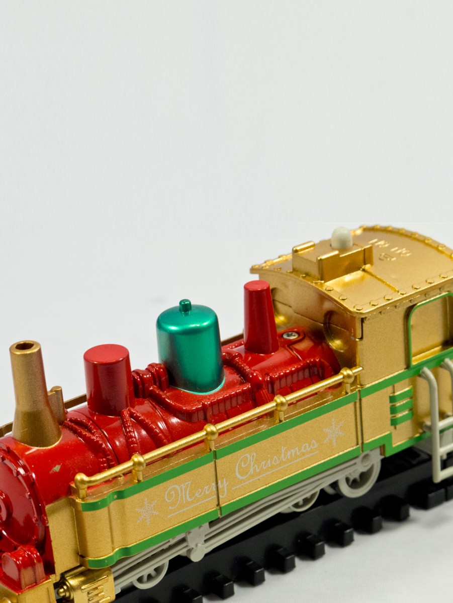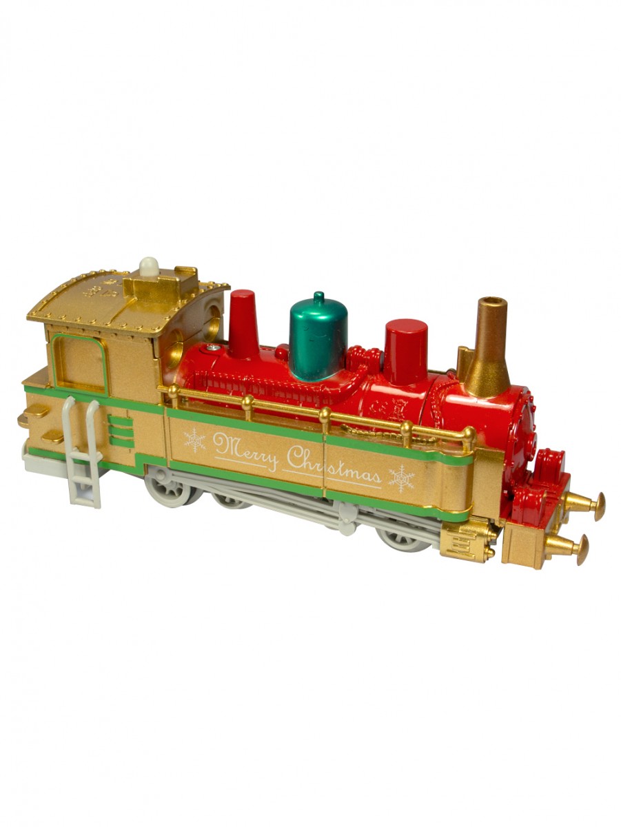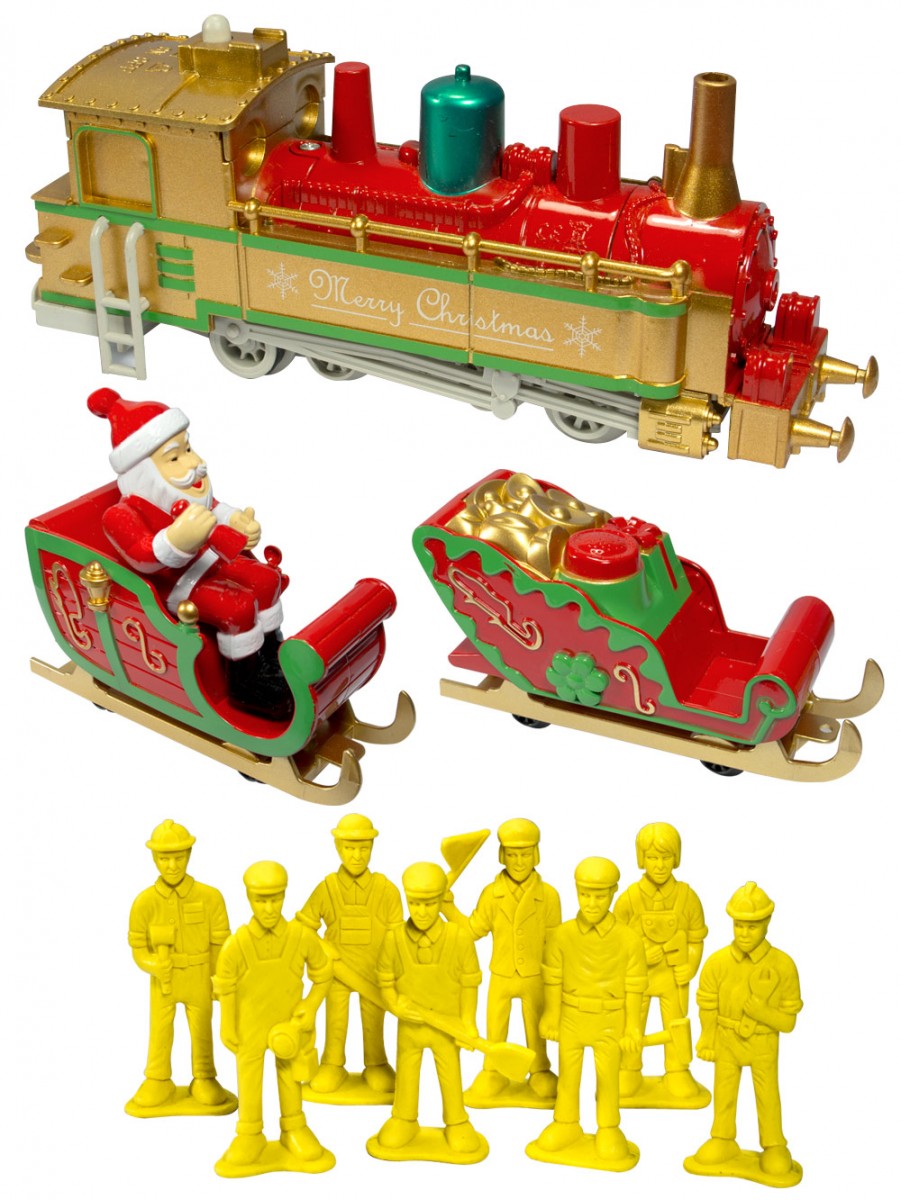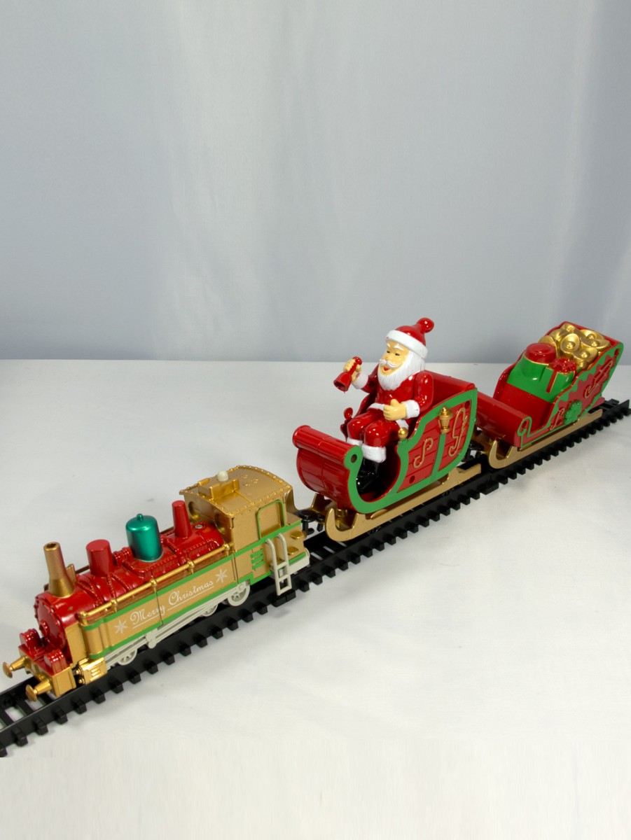 Train set includes: locomotive, Santa and sleigh, caboose sleigh, Straight and curved tracks and various Accessories