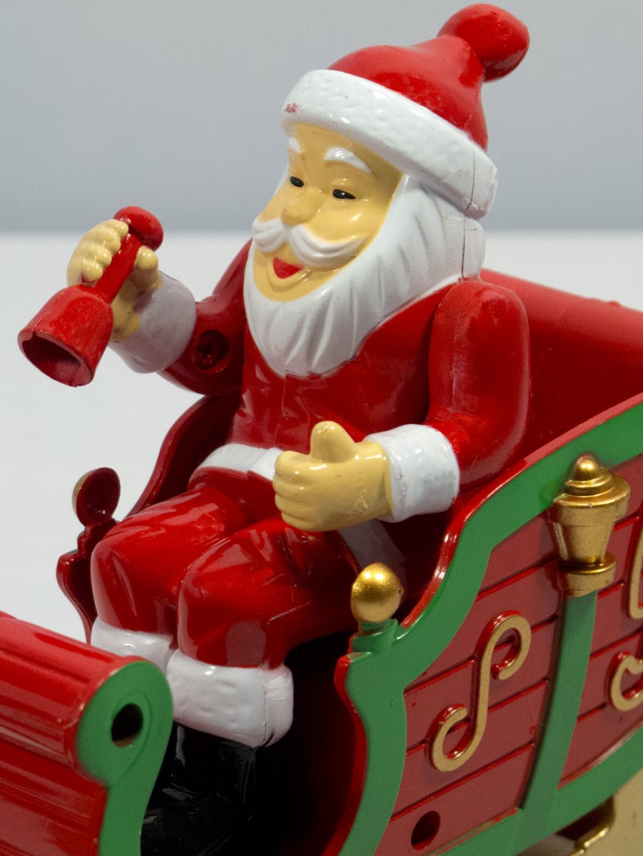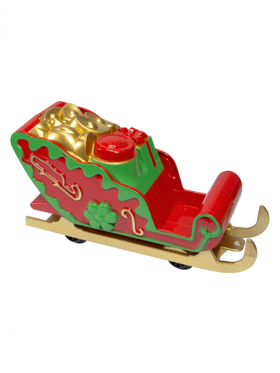 The "Holiday Special Train" appears to be Santa's new mode of transportation. A locomotive in the holiday colors of red, green, yellow, and gold is working hard to pull Santa in his sleigh, and it seems that an additional sleigh has replaced the caboose and is necessary to hold all the toys and goodies to be delivered on Christmas Eve.