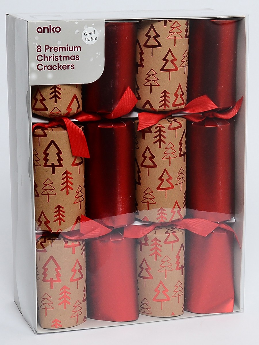 The Christmas Trees Pattern On Kraft Paper Look & Solid Red Bon Bons is beautiful and stylish decorations that can enhance the festive atmosphere of your Christmas gathering. They feature a visually appealing design with a pattern of Christmas trees, all on a light brown kraft paper background. Each cracker is finished with a red knot, adding an elegant touch.