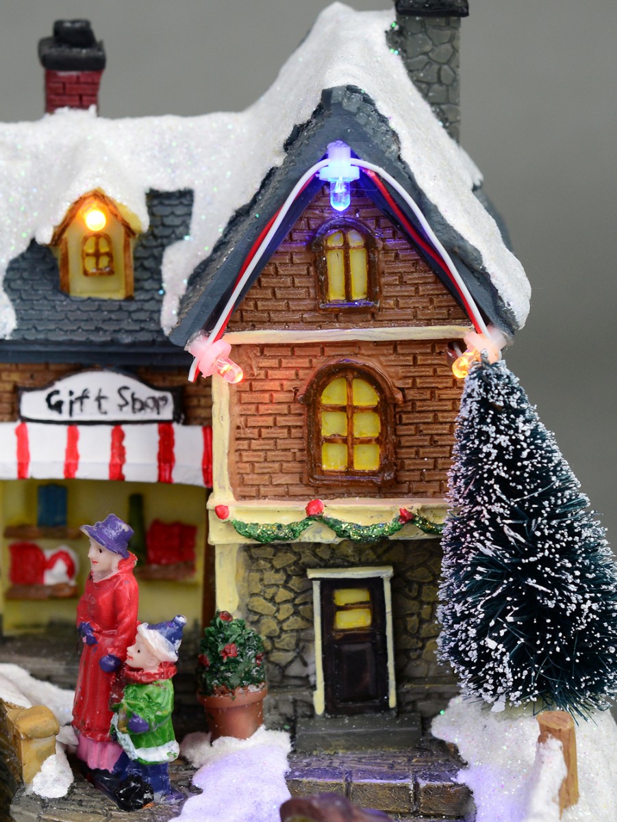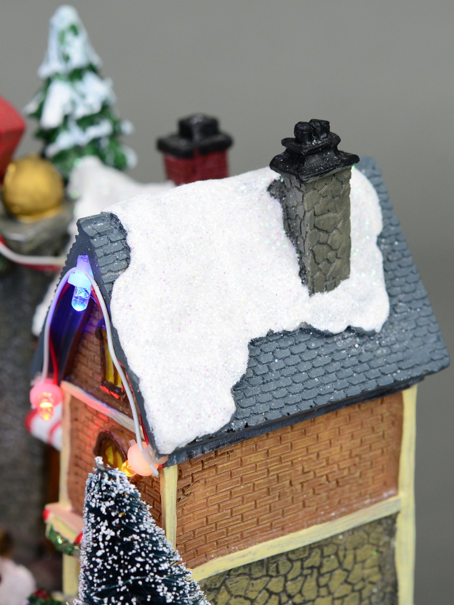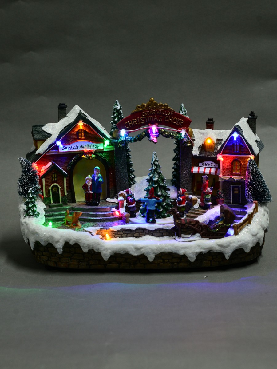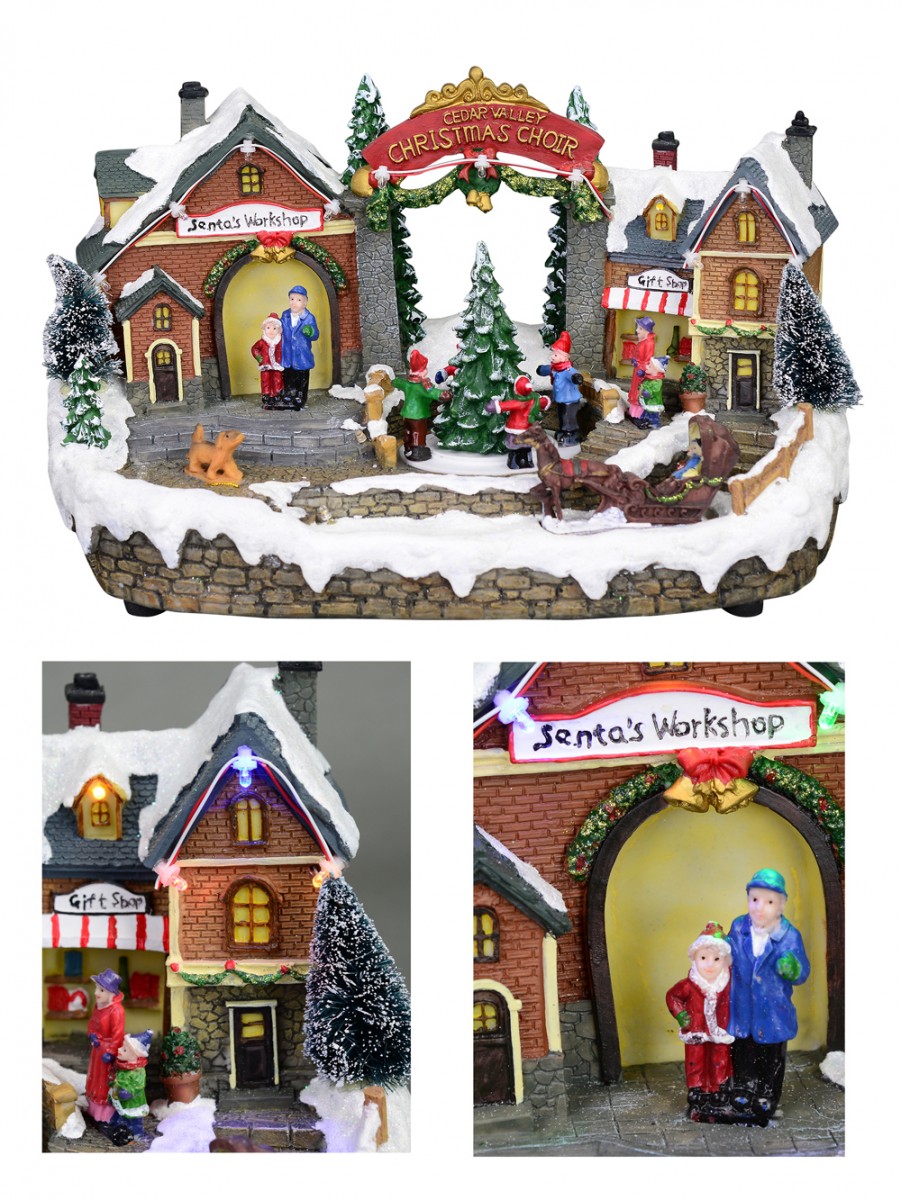 Perfect village scene to compliment your display. This village has snow capped buildings including: Santa's workshop, gift shop and a central Christmas tree which has children moving around it. LED lights hang from the roof of both buildings & are dotted around the display