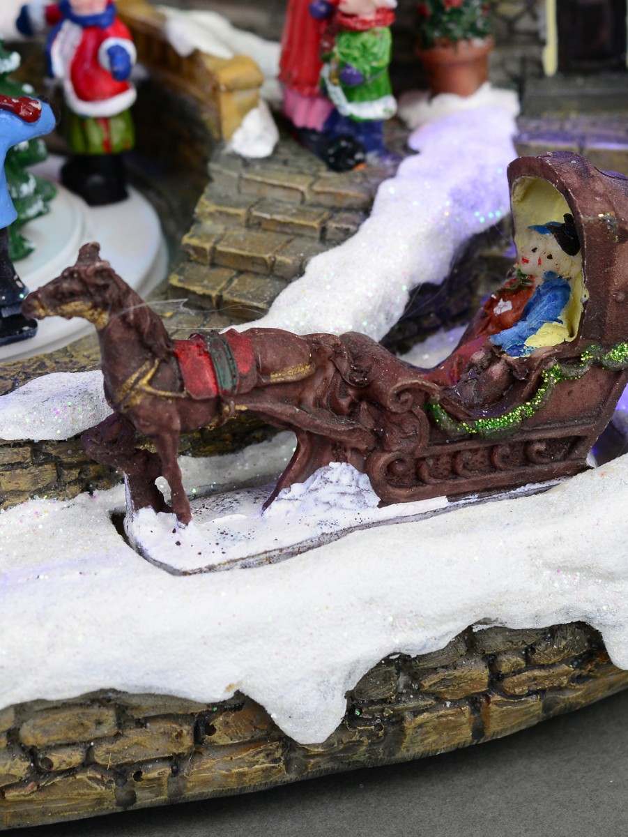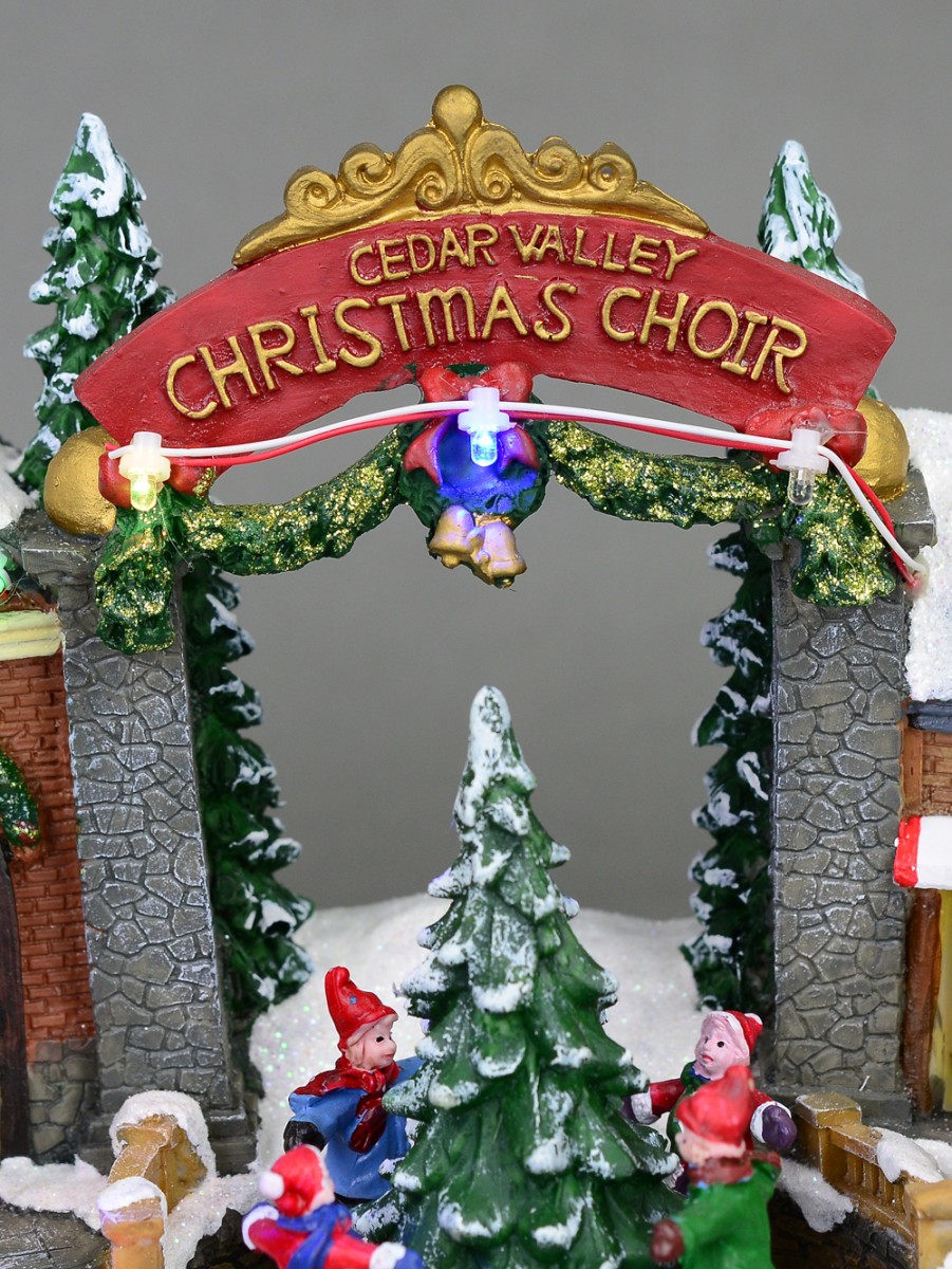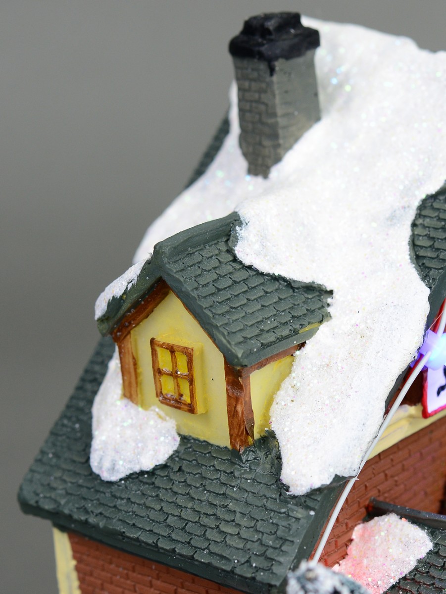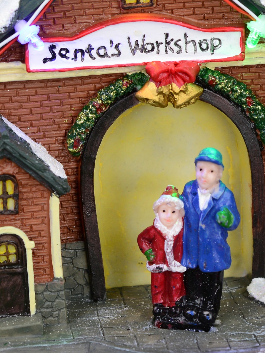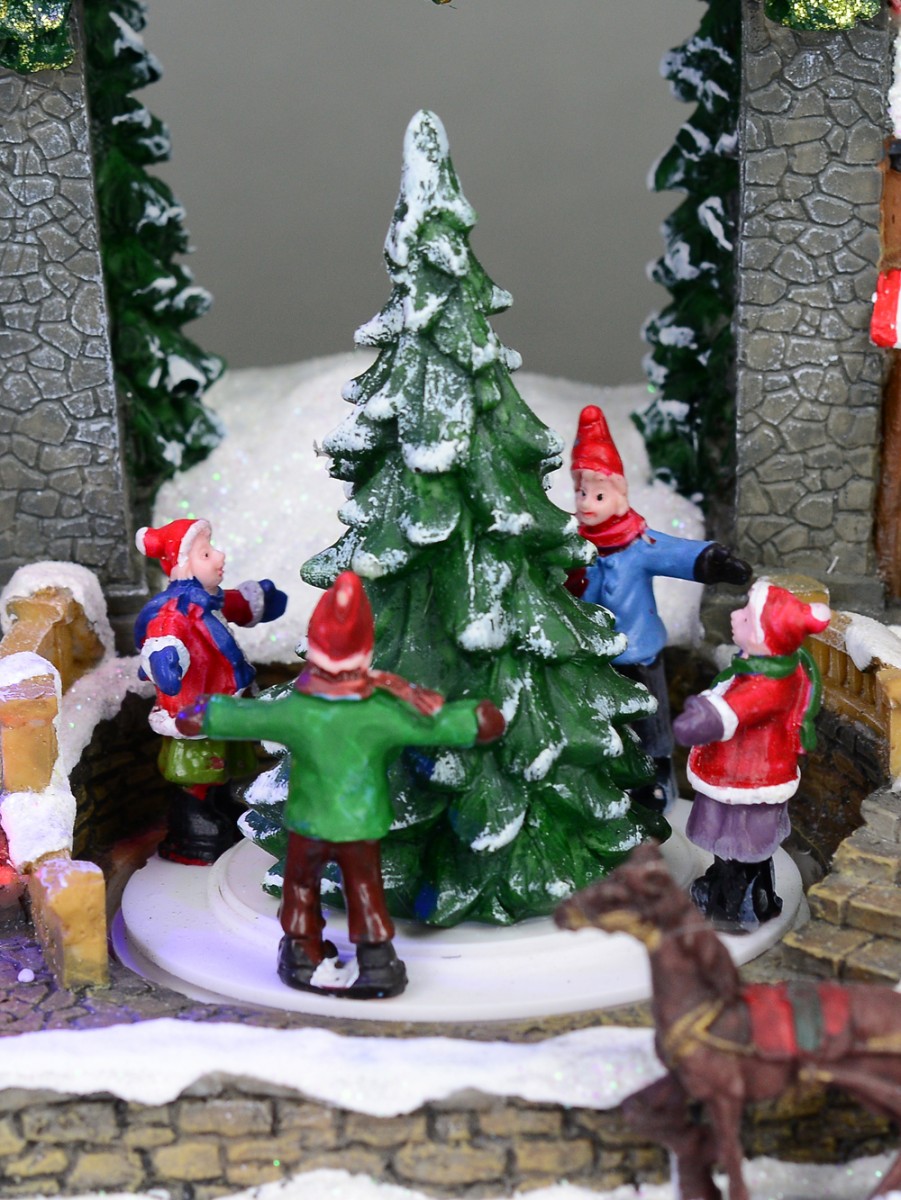 Perfect village scene to compliment your display. This village has snow capped buildings including: Santa's workshop, gift shop and a central Christmas tree which has children moving around it. LED lights hang from the roof of both buildings & are dotted around the display