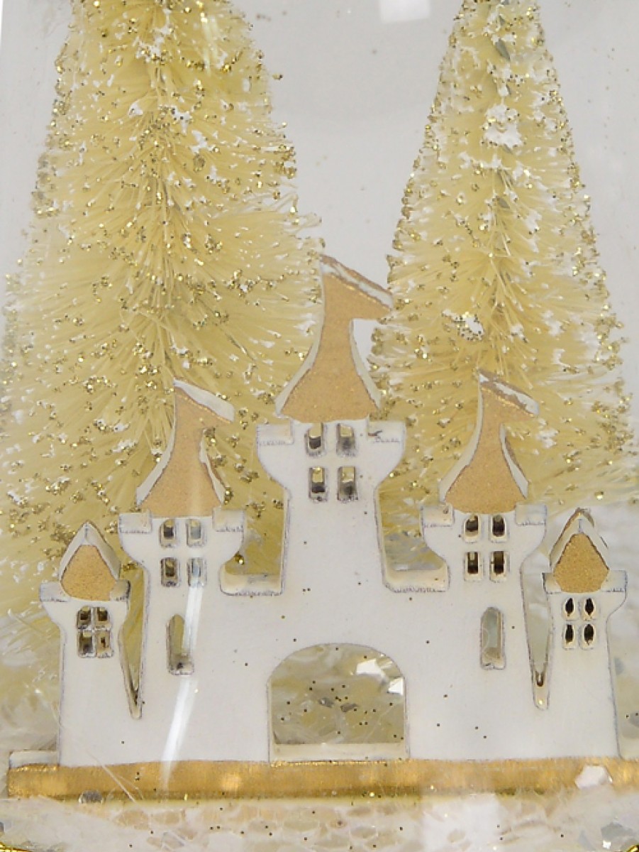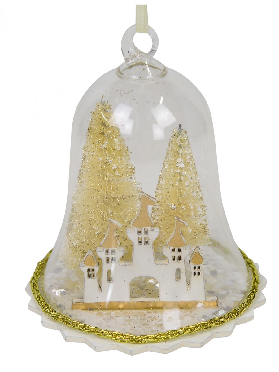 This tree decoration is handcrafted and features a magical winter scene on the inside and is adorably accented with gold chain adornment just above the bottom pointed edging on the rim of the bell. The resulting creation is truly a work of art with the scene inside showing a white unicorn with gold horn and wings standing in front of two lovely gold Christmas trees flocked with silver glitter to resemble snow. Specially made for a winter wonderland theme.