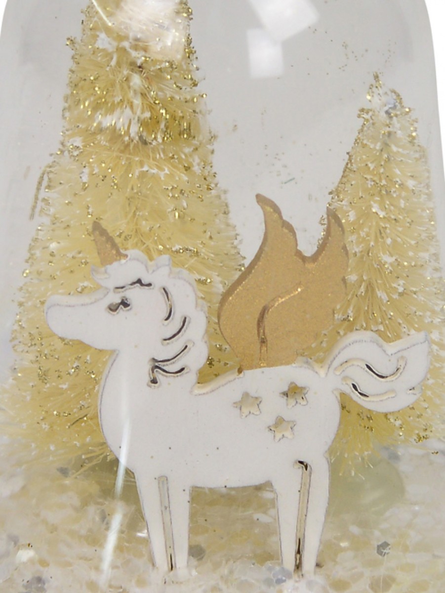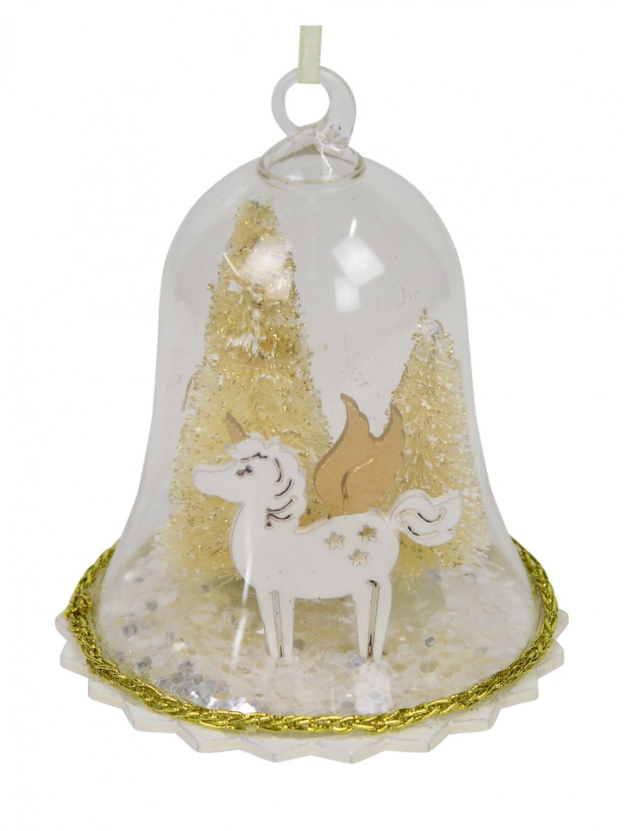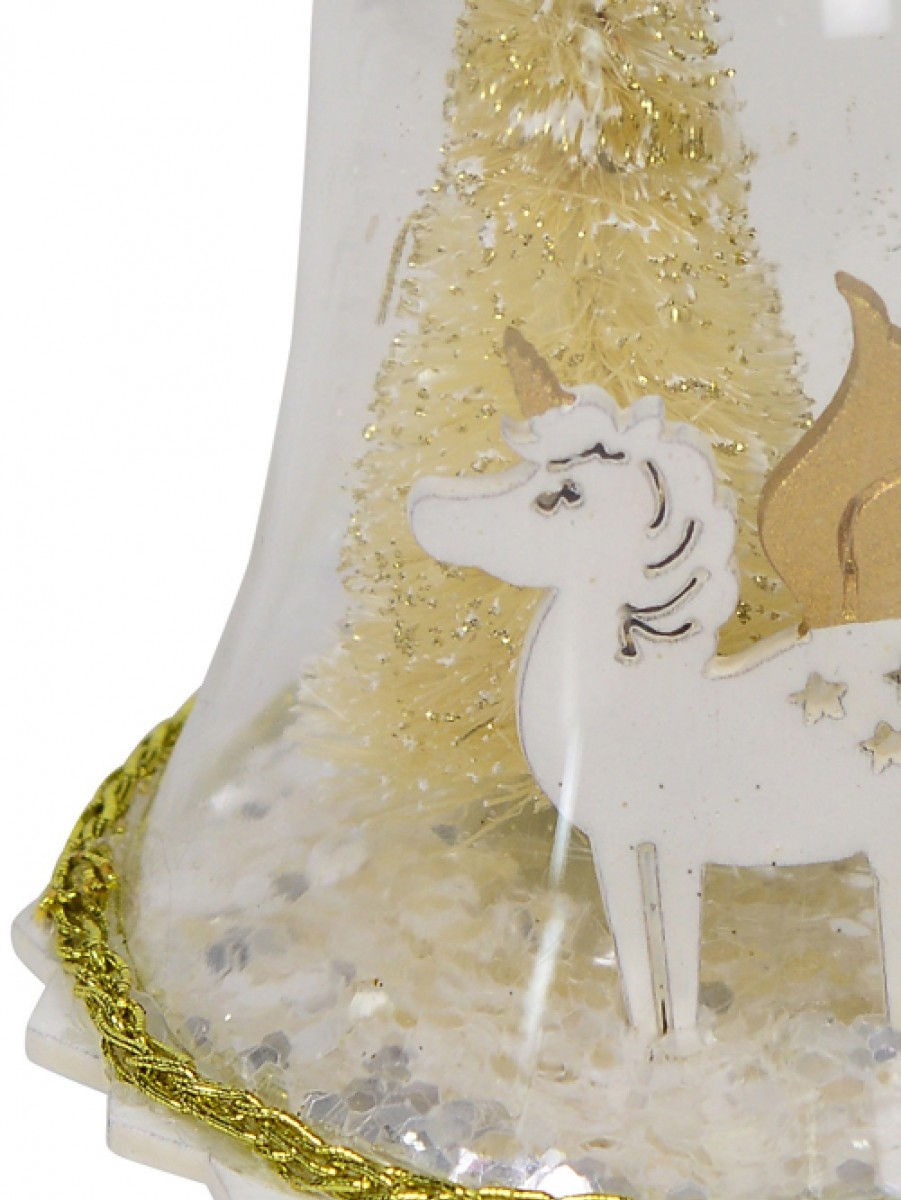 The scene inside this clear bell bauble depicts a castle with fairy-tale gold turrets and two lovely gold Christmas trees behind it creating a wonderful winter display inspired by fairylands having castles, dragons, knights and princesses! It will truly be a statement piece on any tree and also makes a fantastic holiday gift for everyone on your list. The thin gold chain embellishment which runs around the base of the bell adds to its ornamental beauty and with the help of the delicate white ribbon looped through its top ring, you can easily hang it on any tree branch.
