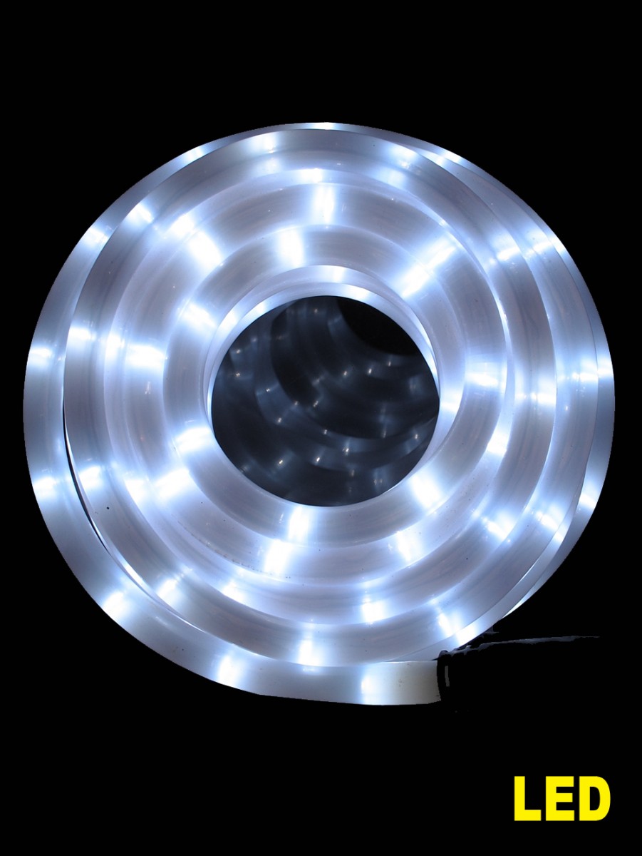 These LED rope lights offer a 144 bulb cool white super bright constant shine for indoor or outdoor use. Light emitting diode (LED) Christmas lights have several advantages over the traditional incandescent. LED rope lights use a tenth of the power of traditional Christmas lights conserving money and the environment. They also have a long lifetime while being very low maintenance. The individually sold six metre rope of constant shine LED lights in cool white can be used anywhere traditional Christmas lights are used. Try wrapping them around trees for an astonishing display of magic and whimsy. They can be used to line the edges of the home outdoors, such as the gutter, roof, and windows. Or bring the low power LED lights indoors.