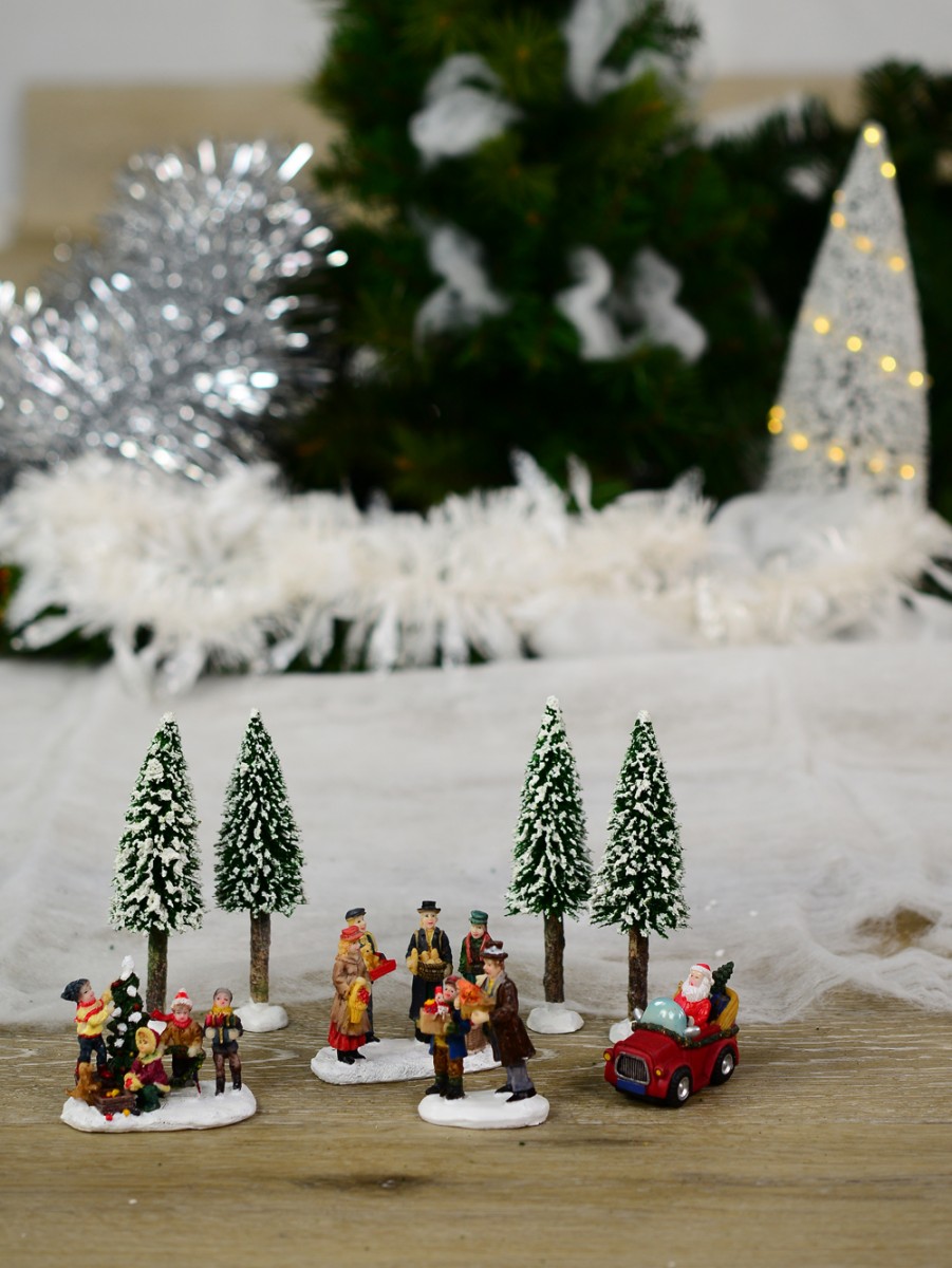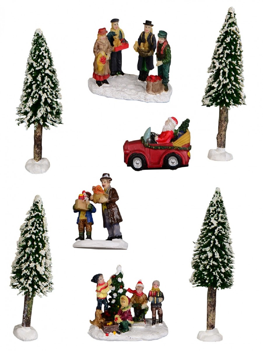 There are four human figurine and four snow frosted Christmas tree figurine in this 8 piece set of Cool Cruising Santa, Decorating Tree & Gift Selling / Buying Figurines. Of the four human themed figurines, one showcases Santa driving a garland decorated convertible car with a cut Christmas tree in the backseat. Another piece features four kids and a dog decorating a Christmas tree. The other two human figurines seal with either having bought or in the process of buying and selling groceries and Christmas items. You can place these figurines individually in strategic points of your house or group them together for a collective decorative effect. You can place it on living room tables, dining tables, display shelves, and even office tables.