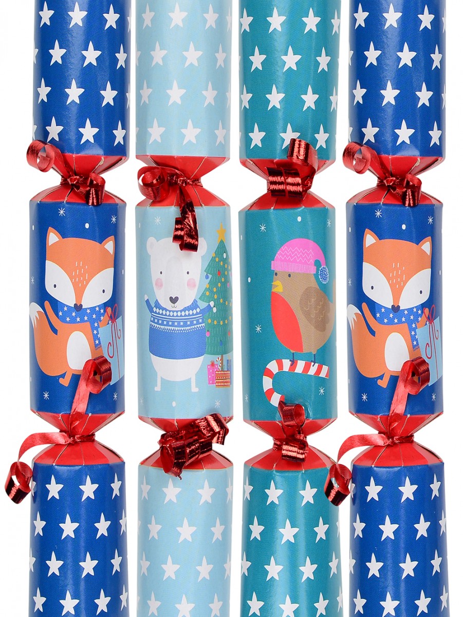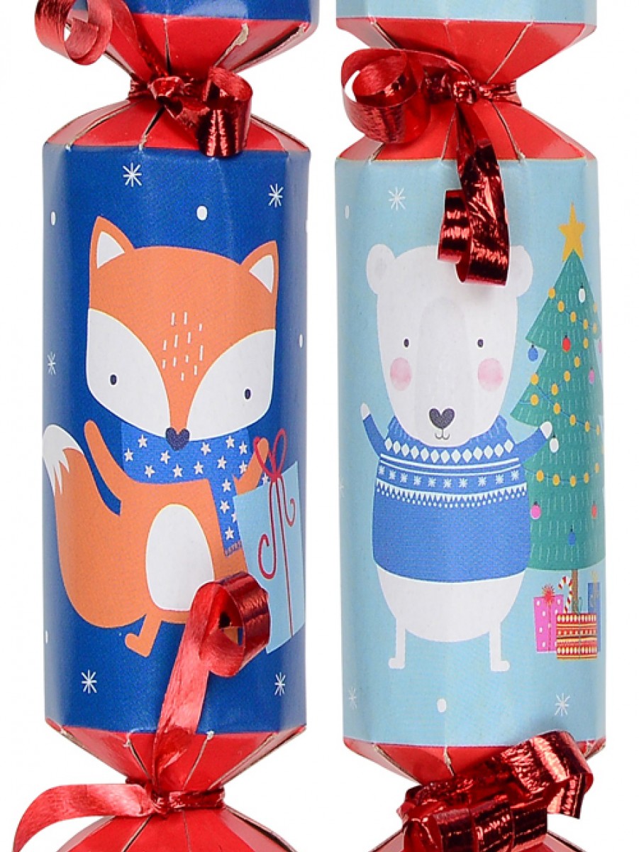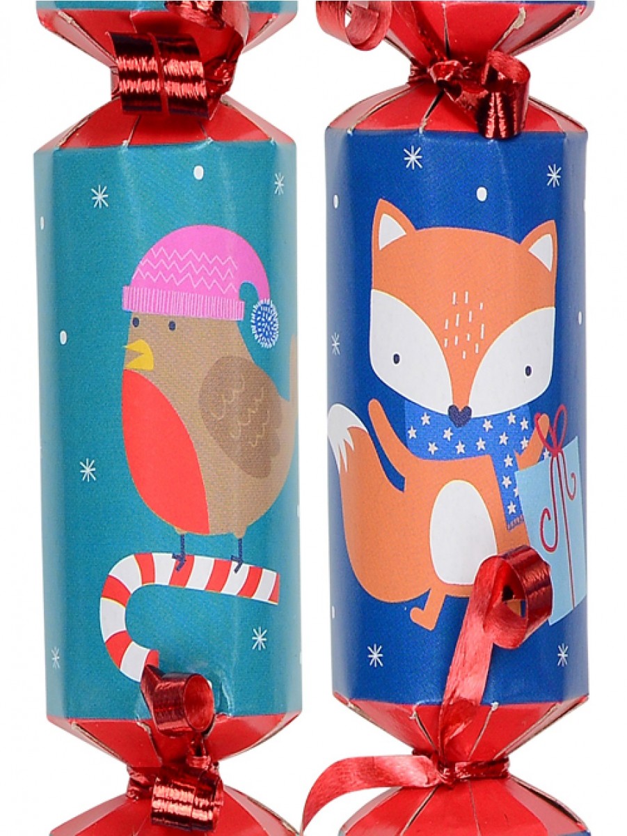 These are mini Christmas crackers with various Christmas critters & white star handles pattern which gives it a royal look and feel. These blue bon bons come in not two but three designs of one pattern including light blue cracker with cute polar bear with Christmas tree an the second pattern is a dark blue cracker with cute fox in Christmas scarf. The third deisgn is a special one including aqua cracker with cute birdy on a candy cane with a cozy beanie. In this pack of 12 crackers, each Christmas cracker includes a snap, sticker, hat & joke and contents of bonbons are sealed with metallic red ribbon at twists so yeah its a great deal for you! These Christmas crackers are just great for Christmas dinner or lunch, be it in December or July!