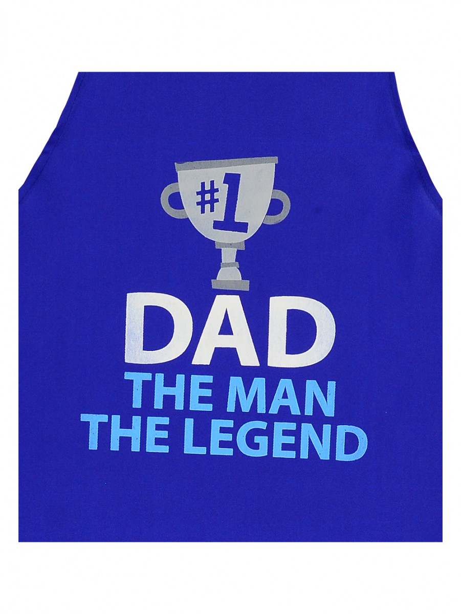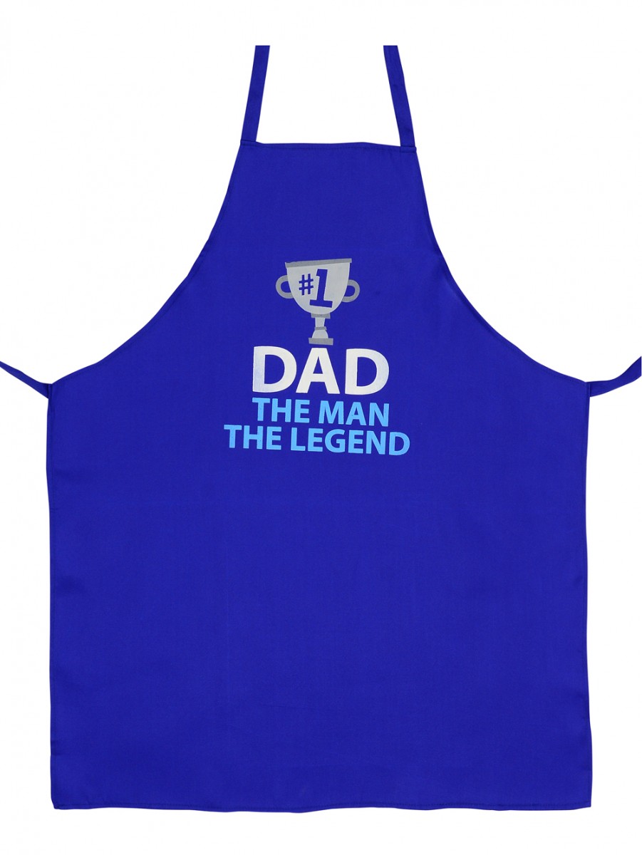 Delight Dad this year with this fun apron! The apron is a lovely blue in colour, with 'Dad. The Man. The Legend' printed on the front. Font is white and soft blue in colour, with a grey trophy with #1 printed - sits just above the message