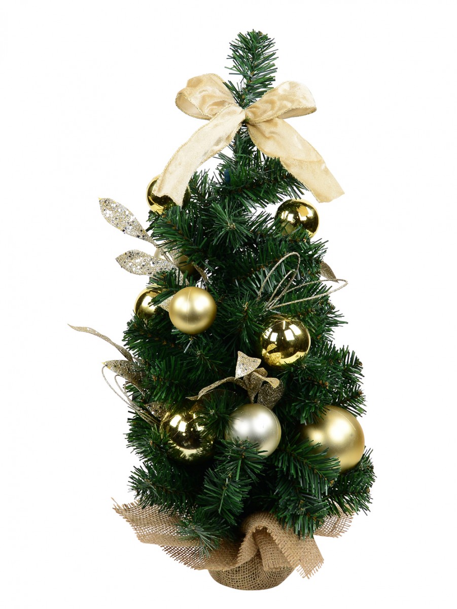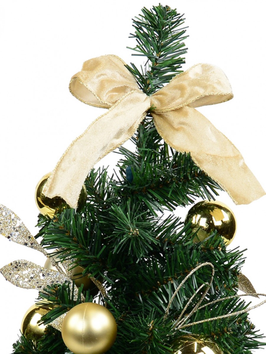 • Luxe pine Christmas tabletop tree decorated with two tones of gold & champagne baubles, leaf picks & ribbon bow