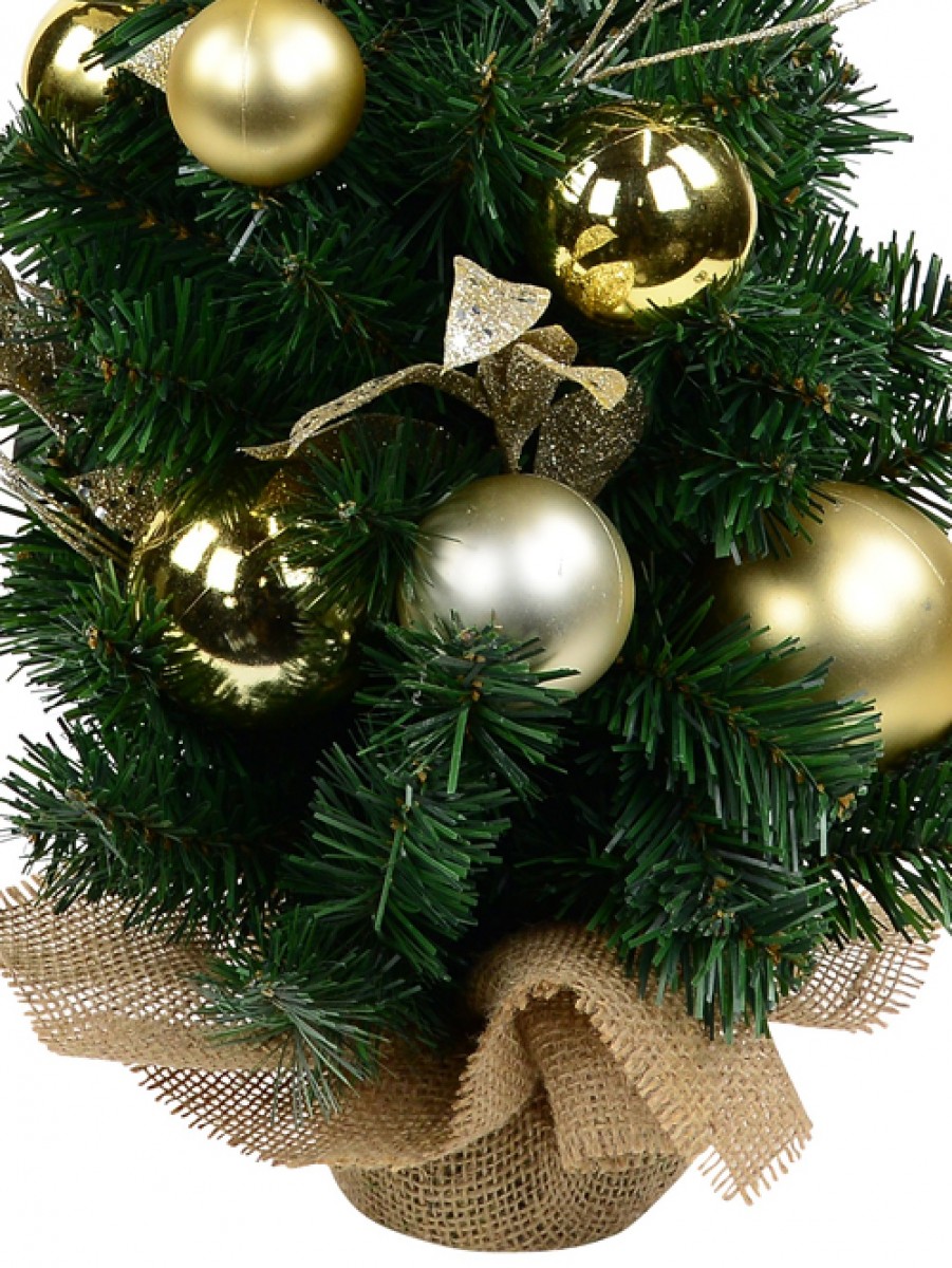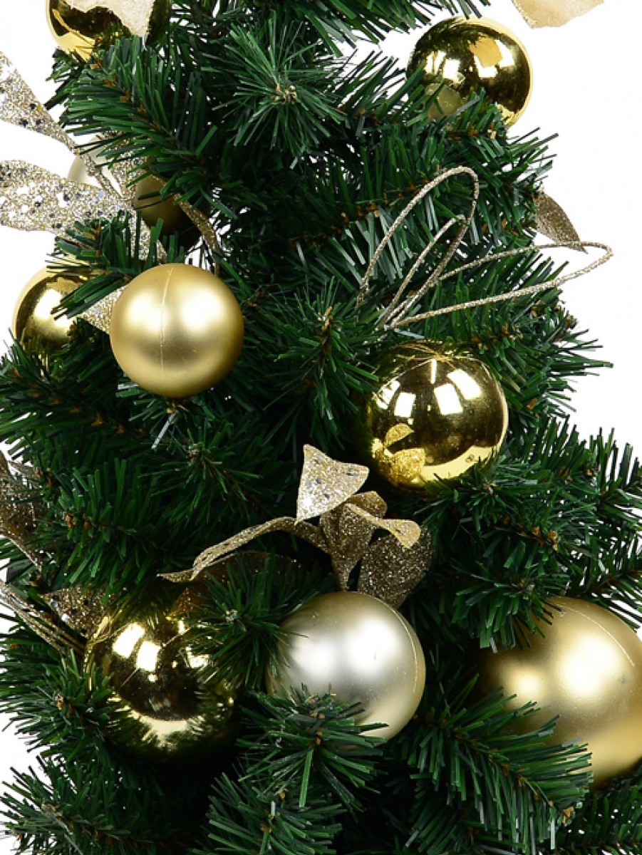 This table top Christmas tree is beautifully decorated with luxe gold and champagne baubles, holly leaf decorations and gold ribbon. The decorations come with the tree so all you have to do is unpack and spruce. In less than a minute or two, you'll bring the joy of the season to your home