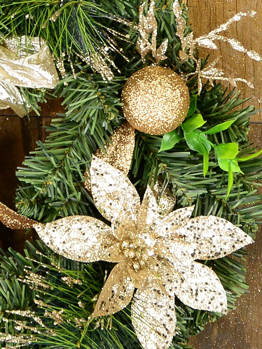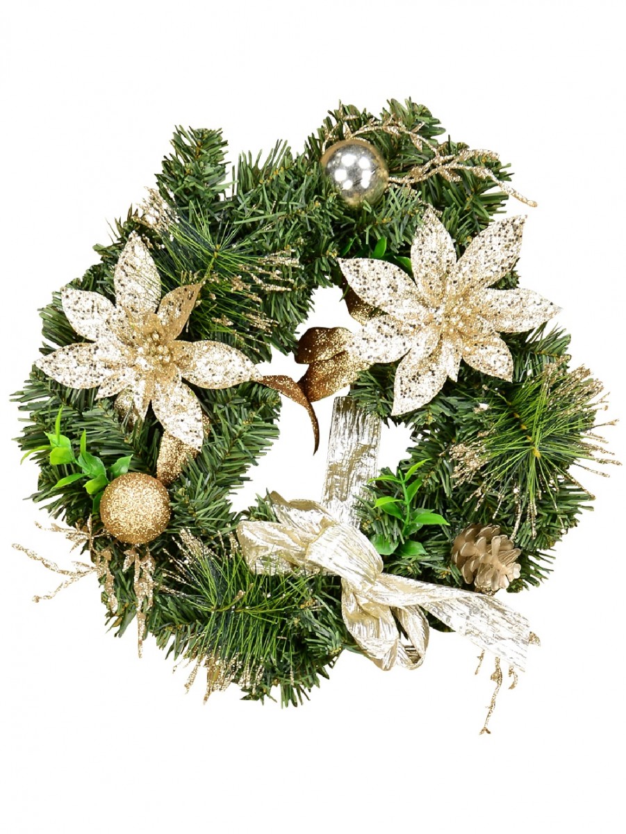 Christmas wreaths are symbolic of Christmas and have been used as a decoration for centuries. With the increasing demands from people, the markets are now flooding with different styles and designs of wreaths one can choose from for Christmas. If you are searching for something elegant to supplement your decorations, look no further! This floral pine wreath is sure to enhance your Christmas look. This 40cm x 10cm x 40cm wreath is adorned with baubles, poinsettia, leaf stems, bottlebrushes, pine cones and a ribbon bow - all in the shades of gold. The pine branches on the Christmas wreath give a rich evergreen look, much sought after by people for Christmas. This wreath is perfect for both traditional and modern Christmas decorations. It requires no assembling, so pop it open and place it among other Christmas decorations without any hassle.