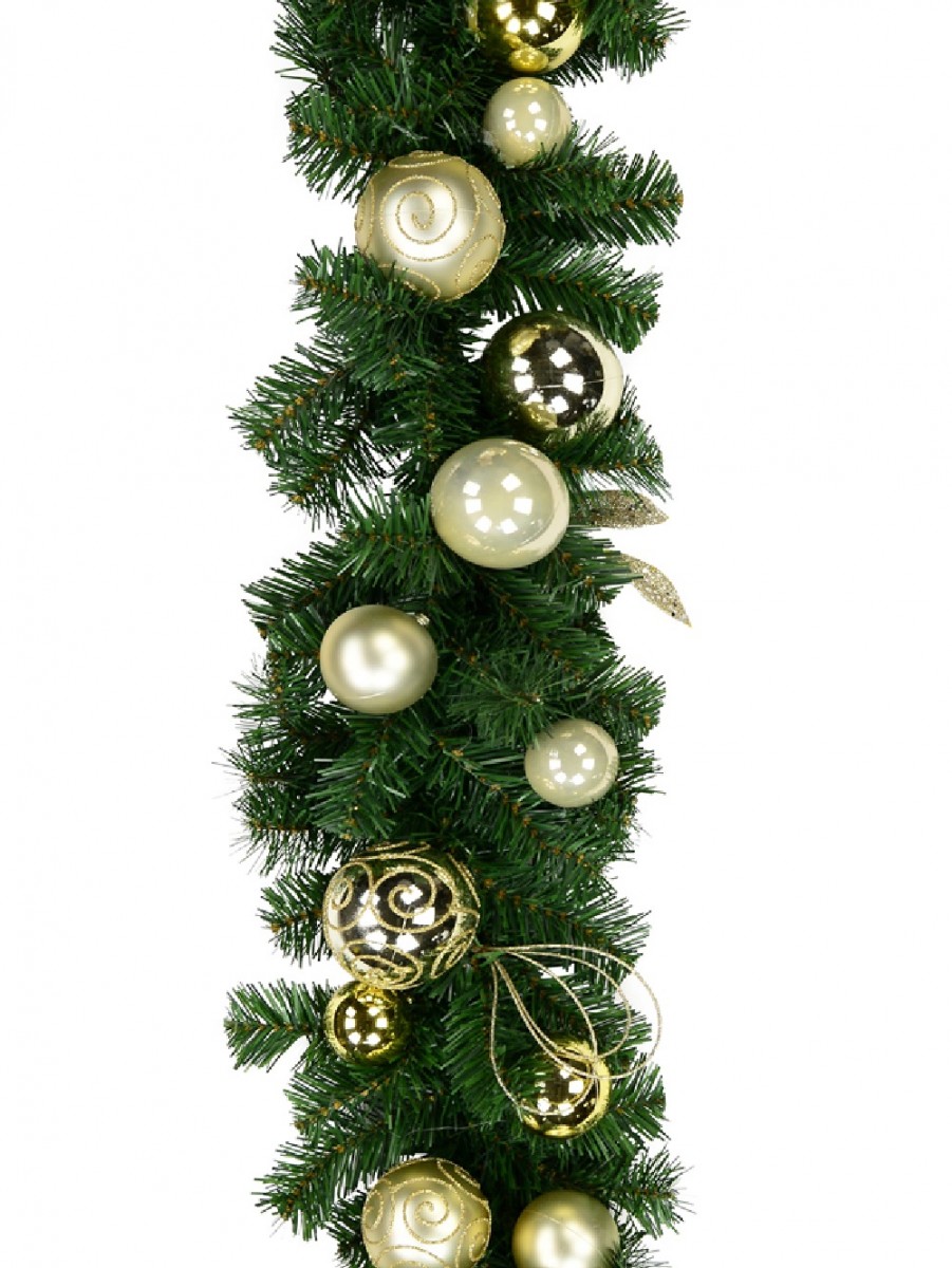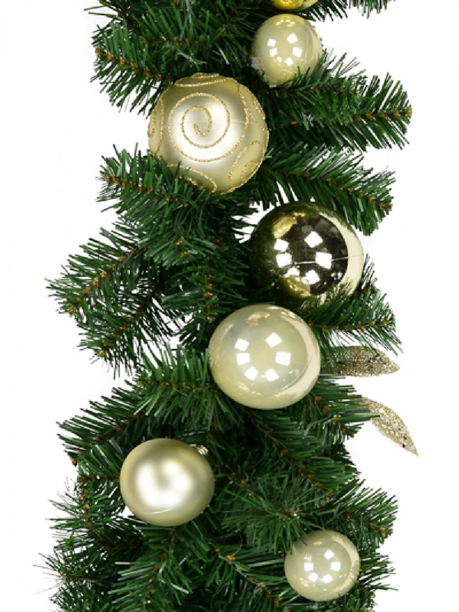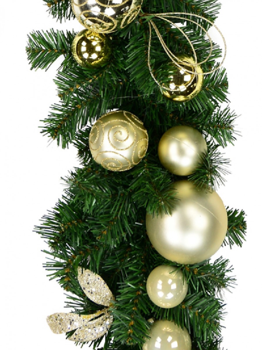 This festive season let our Pre-decorated bauble pine garland that is visually beautiful and still multi-functional in use adorn your home and business. This luxe pine garland is 2.7m x 12cm x 22cm in dimension and decorated in two colour tones of gold and champagne coloured baubles that are varied in size and design with some having gold glitter swirls.