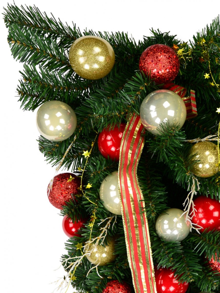 You will certainly want to re-use this deluxe pre-decorated pine teardrop year and year! Measuring 90cm long, this teardrop garland is large and breath-taking. You can hang it on a wall, door, garage door or anywhere else where you want to make a bold statement. While this decoration looks elaborate and time-consuming to put together, it is very easy to assemble, simply unwrap it and spruce it up and it is ready to hang. This beautiful pine teardrop garland is pre-decorated and ornate. Realistic pine needles are dressed in glimmering baubles of red, gold and champagne. A red and gold ribbon cascades down the pine teardrop while wire with golden stars wraps around the pine. Glimmering twigs decorate the pine as light reflects all of the glittering and shimmering surfaces. Make sure to place this beautiful piece near a lamp or twinkle lights to watch the shine. Your guests are sure to be wowed by its splendour. Creating an elegant holiday display is easier than it may seem with pre-decorated accents from the Christmas Warehouse. The Christmas Warehouse has everything you need for impressive decoration this holiday season. From ornaments and light up displays to village and floral picks, find everything you need at the Christmas Warehouse.