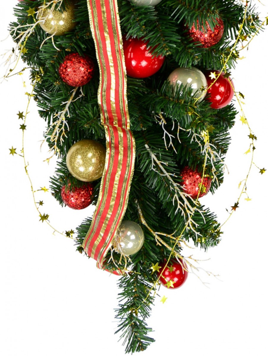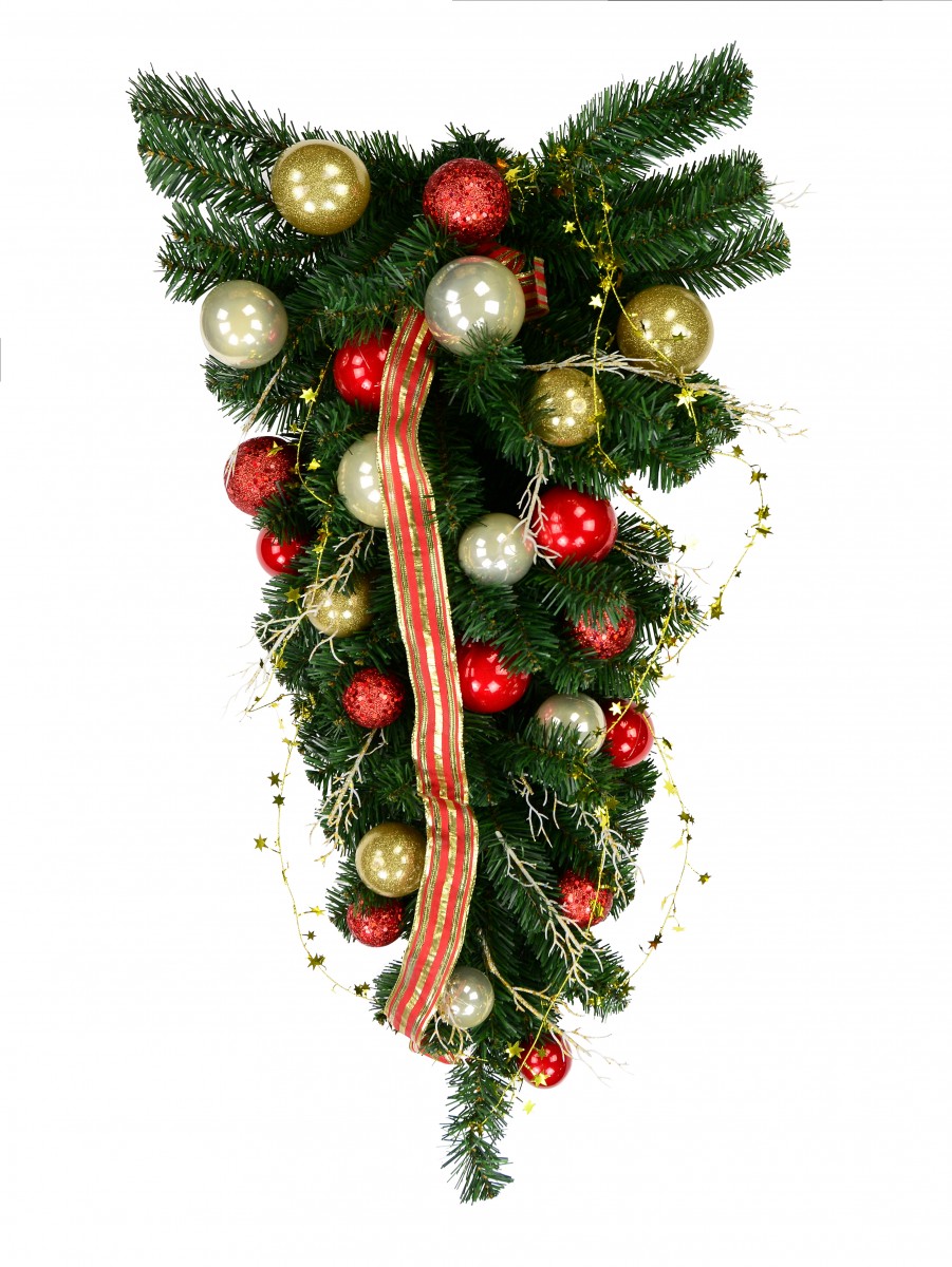 • Classic pine Christmas teardrop swag with baubles, ribbon, wired garland & twigs
