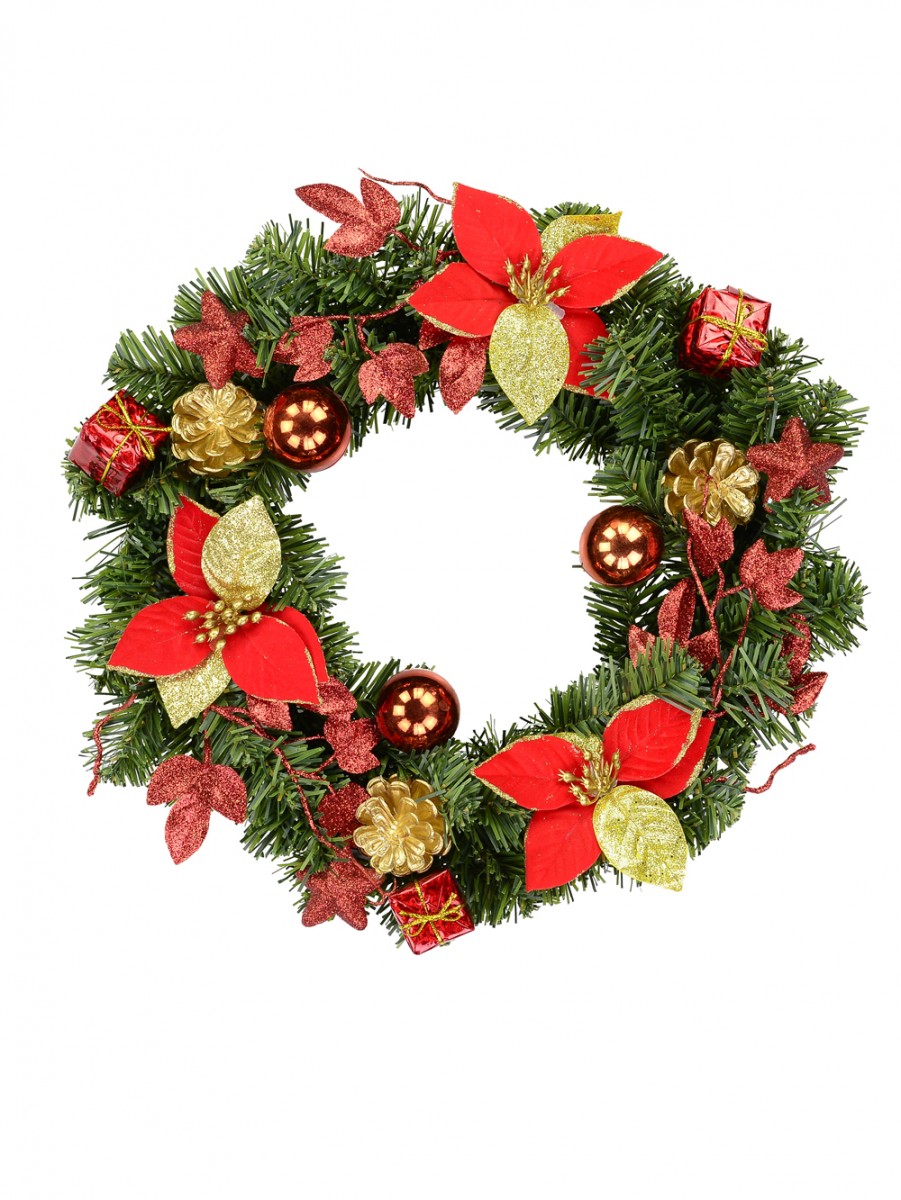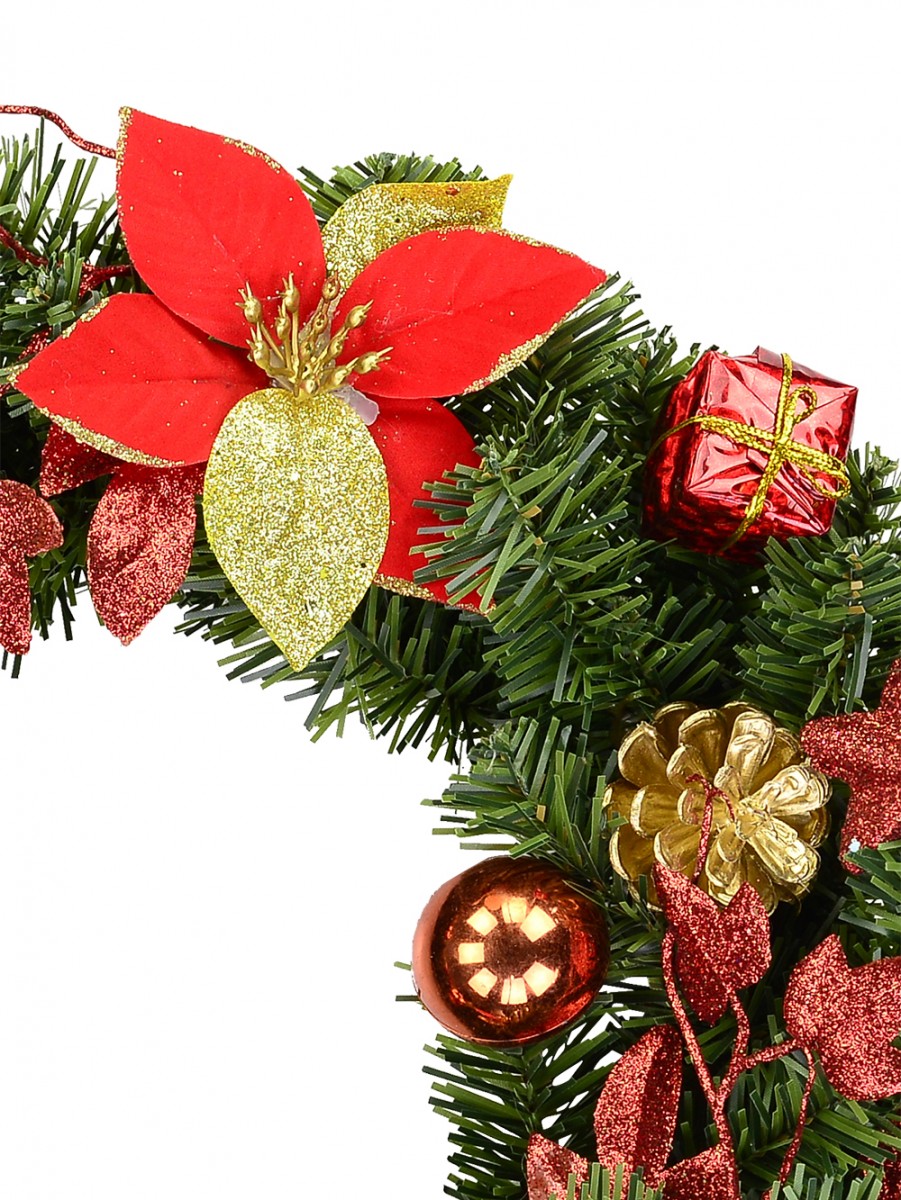 Lush with varied types of greenery, interesting objects from nature like gold leaves and pinecones, red and gold poinsettia picks, baubles and tiny red gifts and just the right size; make this wreath a guaranteed hit! It can hang on a door or wall, a mirror or even above the fireplace or inside a large frame and it will look stunning. Measuring 30cm x 30cm in dimension, this wreath comes ready to use and you will never get bored of decorating your place, party or event with its attractive design that is sure to garner compliments from one and all.