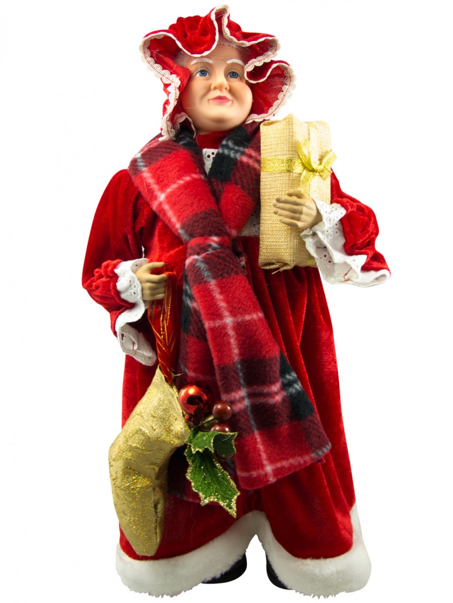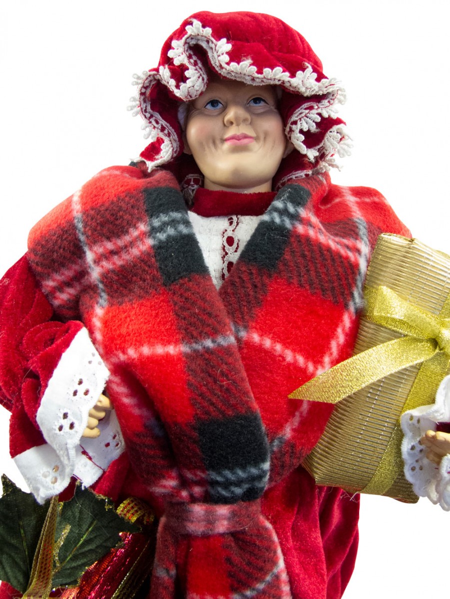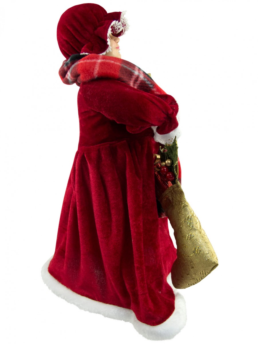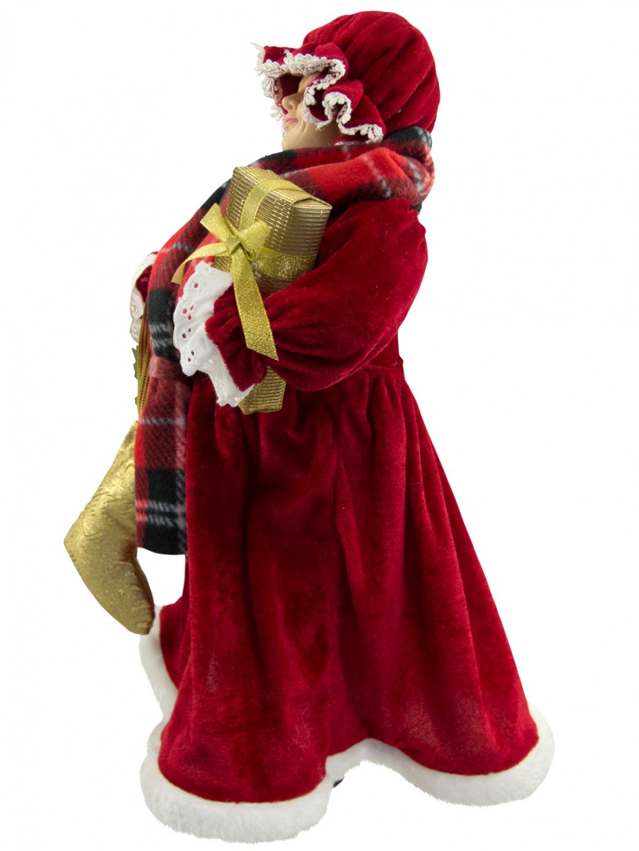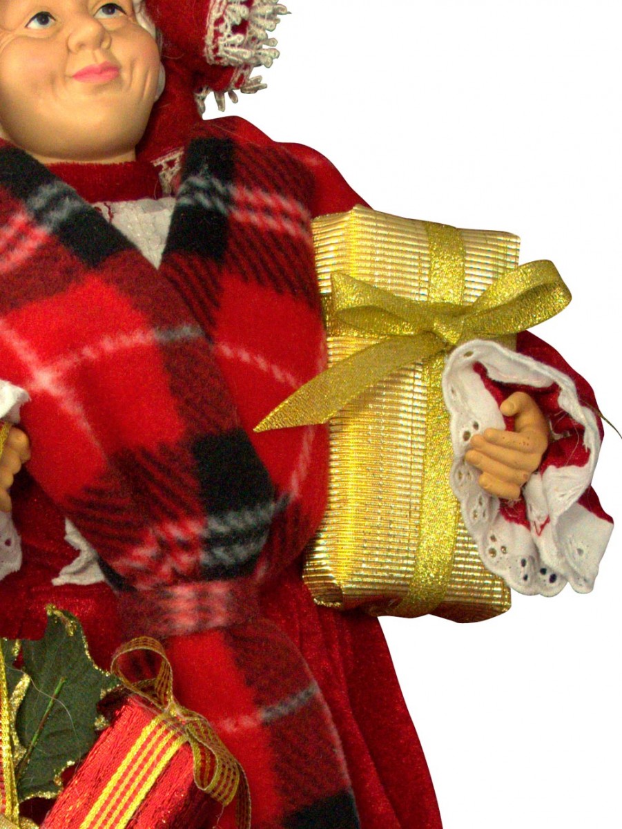 Show some appreciation for the woman behind Santa Claus! Display on her own or next to a Santa figurine (sold separately). Freestanding decorative figurine shows Mrs. Claus looking upwards with a hint of a smile- perhaps gazing at Santa as he flies through the sky! She wears a red velvet dress with white fur trim and a matching bonnet trimmed with lace. A red tartan shawl keeps the North Pole chill off, and Mrs Claus holds a gold stocking in one hand and a gold present in the other. A sprig of holly and a red wrapped gift peek out from the stocking. Measures 21 cm x 20 cm x 46 cm