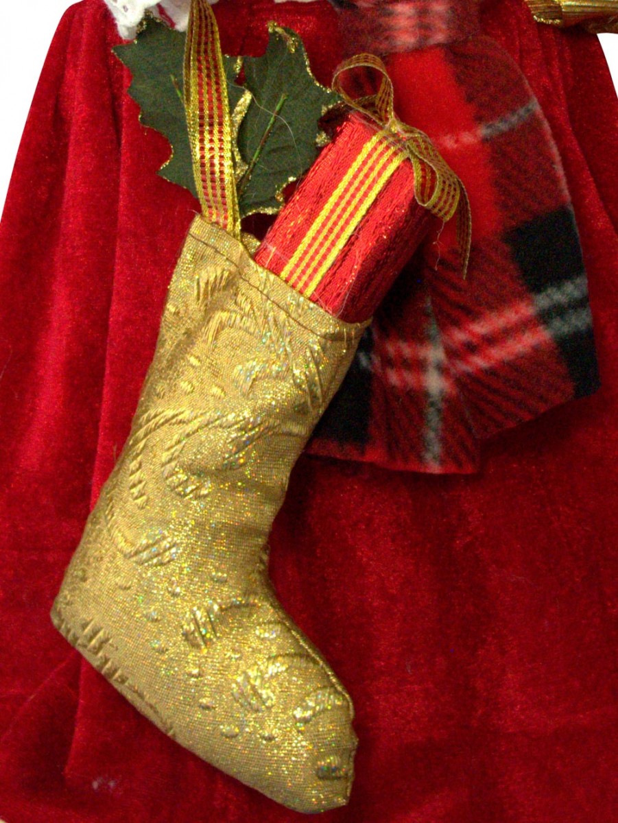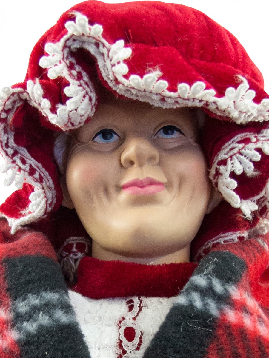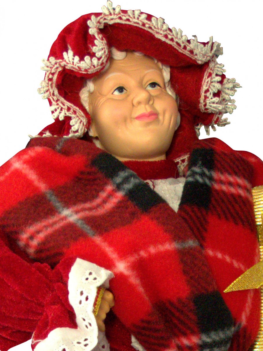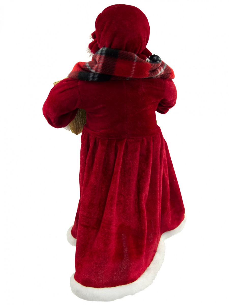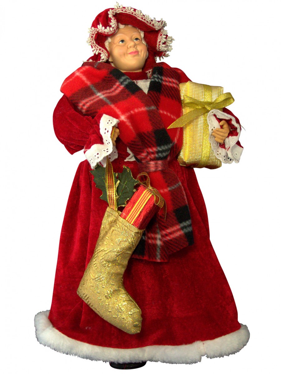 Show some appreciation for the woman behind Santa Claus! Display on her own or next to a Santa figurine (sold separately). Freestanding decorative figurine shows Mrs. Claus looking upwards with a hint of a smile- perhaps gazing at Santa as he flies through the sky! She wears a red velvet dress with white fur trim and a matching bonnet trimmed with lace. A red tartan shawl keeps the North Pole chill off, and Mrs Claus holds a gold stocking in one hand and a gold present in the other. A sprig of holly and a red wrapped gift peek out from the stocking. Measures 21 cm x 20 cm x 46 cm