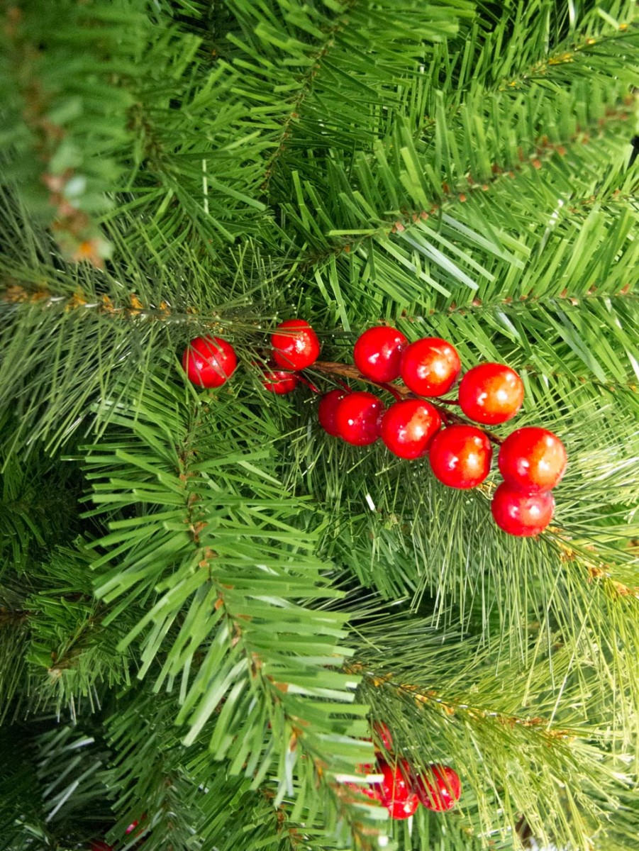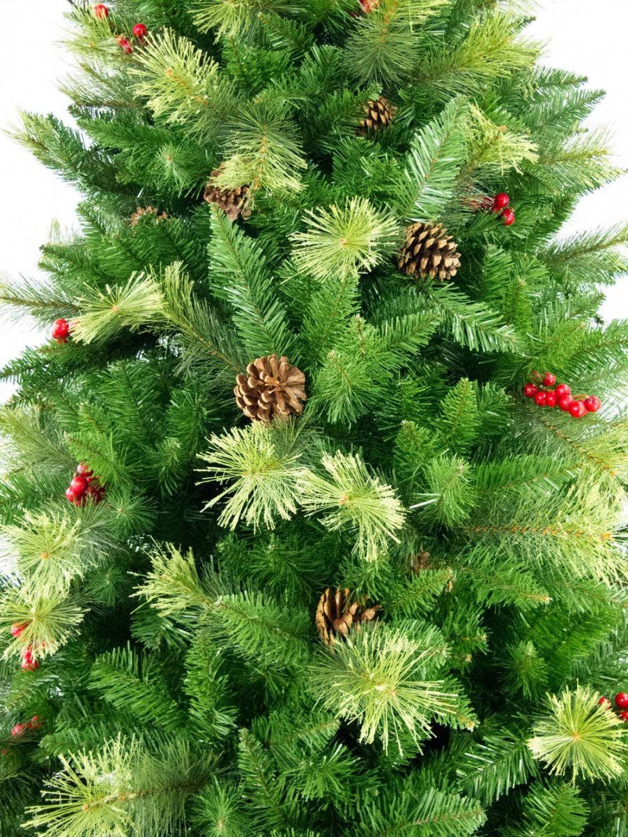 O Christmas Tree! This towering and majestic Douglas Fir will serve your family well for years. 2.3 metre tall tree includes 2026 branch tips and is decorated with 55 red berries and pine cones and has a sturdy metal base. Branches are hinged for easy assembly. This tree will look beautiful in a large room with soaring ceilings with a star atop its 18 cm tip. Unpack, assemble, and spruce with lights, baubles, and other decorations to achieve the look you want. Dimensions are 1.3 m x 1.3 m x 2.3 m (including tip).