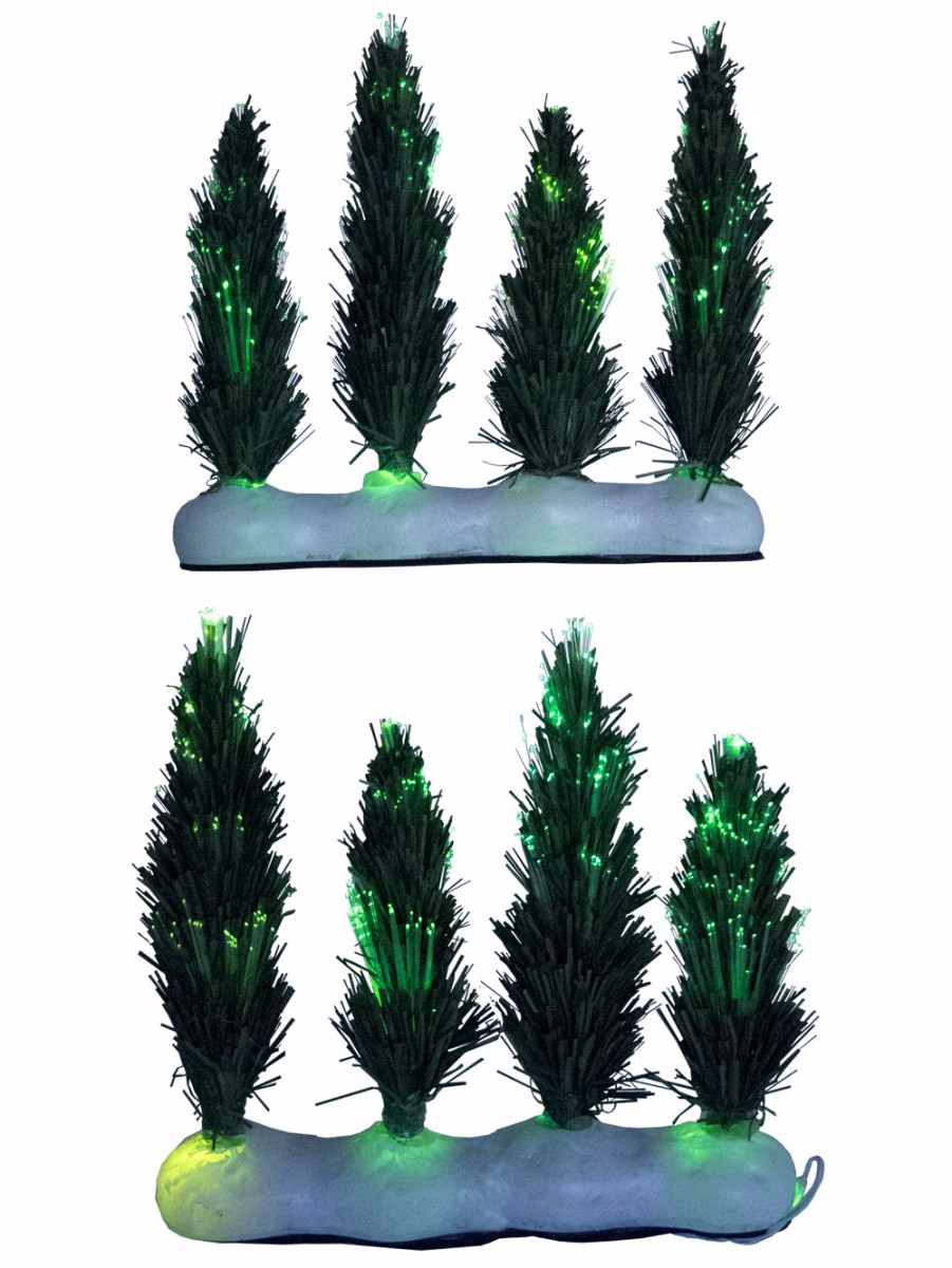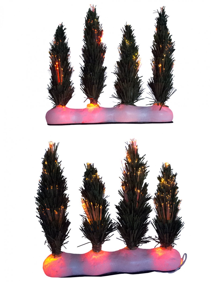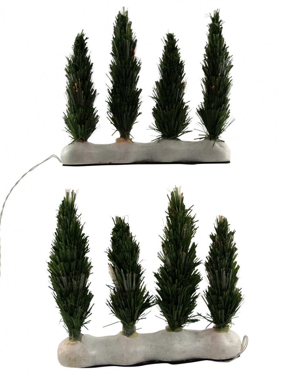 Create a glowing Christmas forest with this set of eight fibre optic Christmas tree figurines. A dusting of snow covers the ground at the base of the trees, while the multi coloured fibre optic trees cycle through their continuous colour changing effect. One row of four trees measures 12 cm x 30 mm x 12 cm, and each set of trees sold includes two rows of four trees each. Purchase more than one set to complement a magical Christmas village scene with some of our assorted figurines or a Christmas scene you already own.