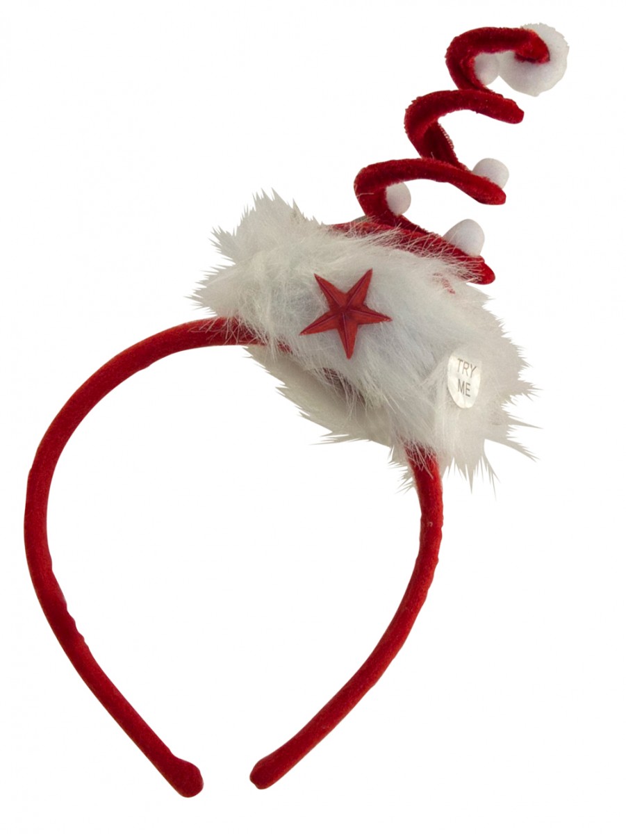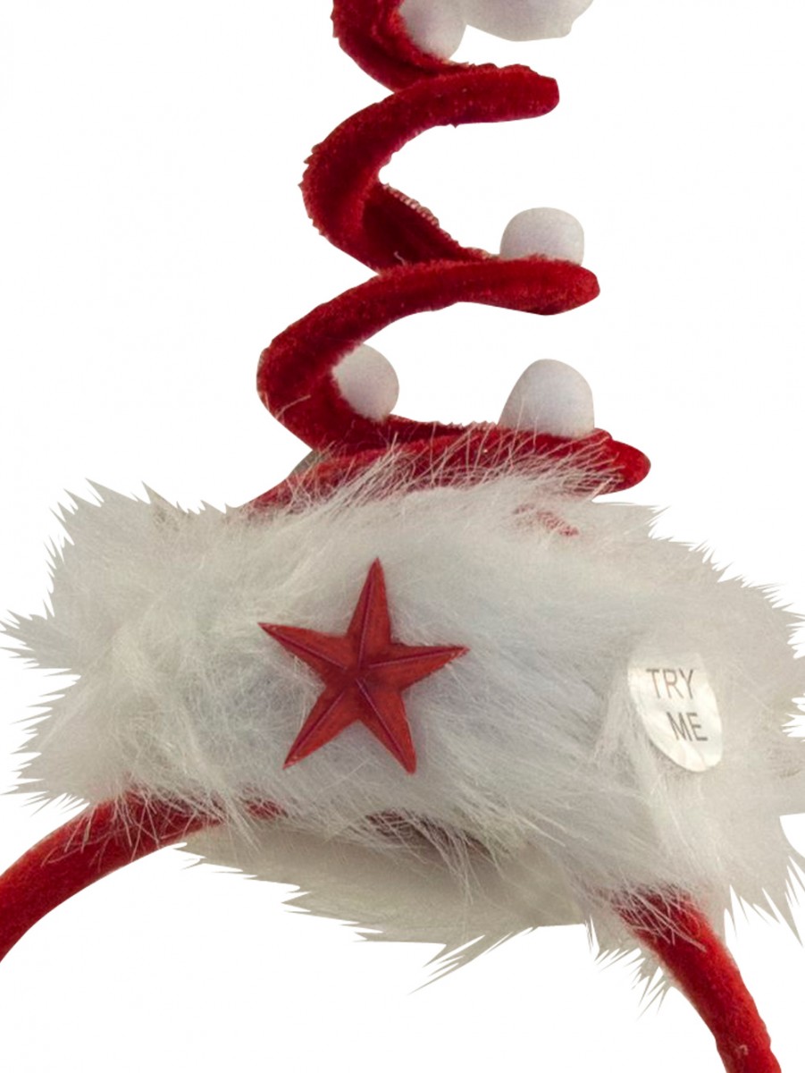 Show off your Christmas spirit loud and proud any day of the week! Whether it is at a barbecue, a tree trimming party, the Christmas concert, or on spirit day at the office or at school... any day is a good day to spread Christmas cheer! Red headband has a white spring hat mounted on the side, decorated with white fur and red flashing star. Red spring is topped with white pom poms. Flashing lights are button operated and battery is included with headband. One size fits most. Dimensions are 12 cm x 26 cm.