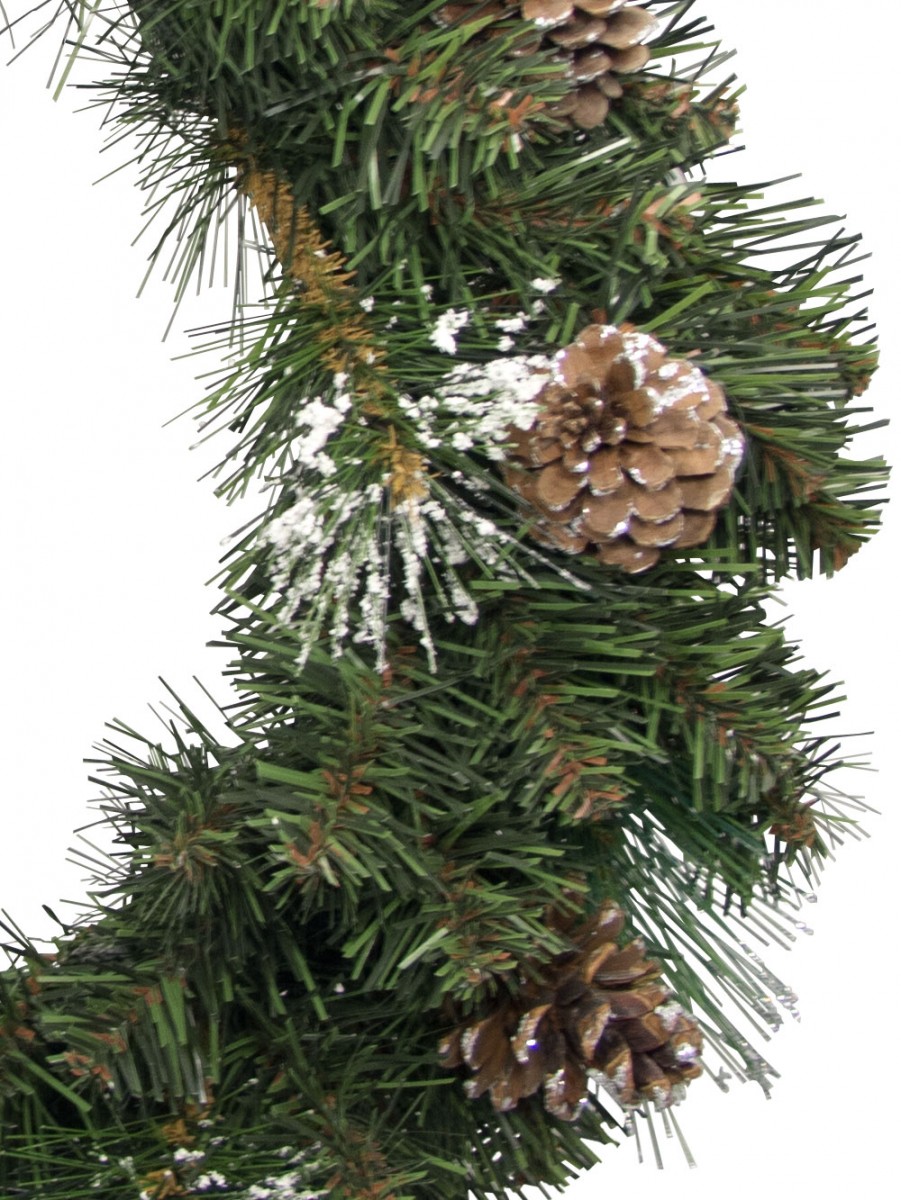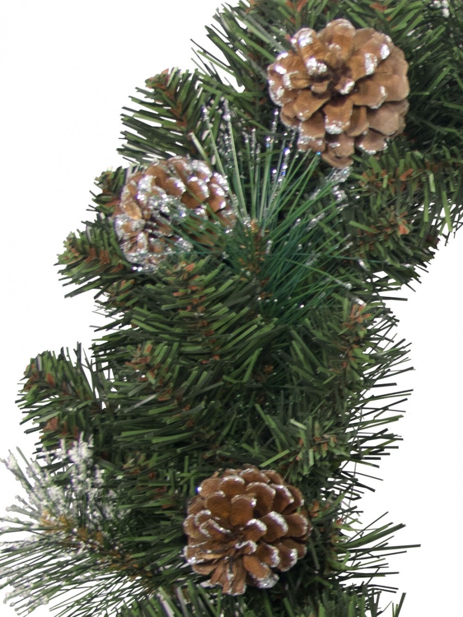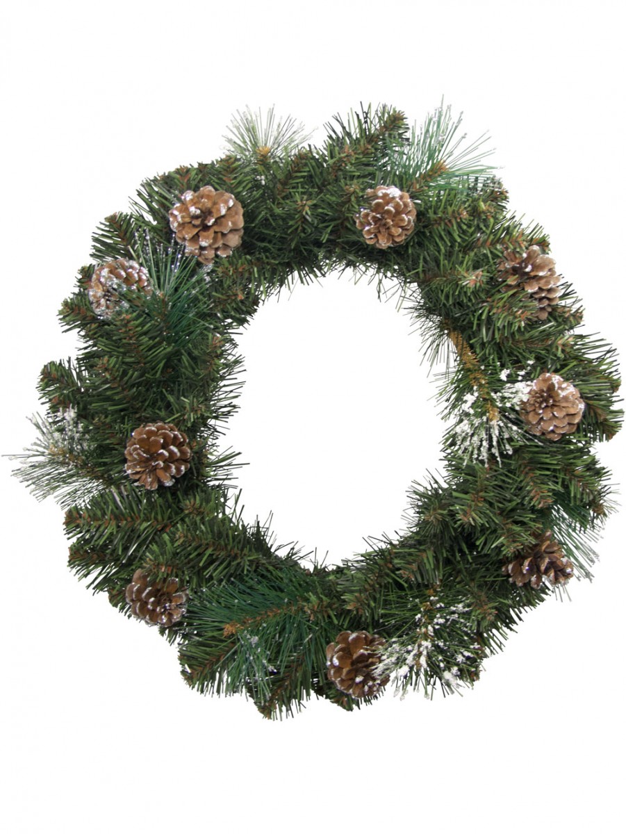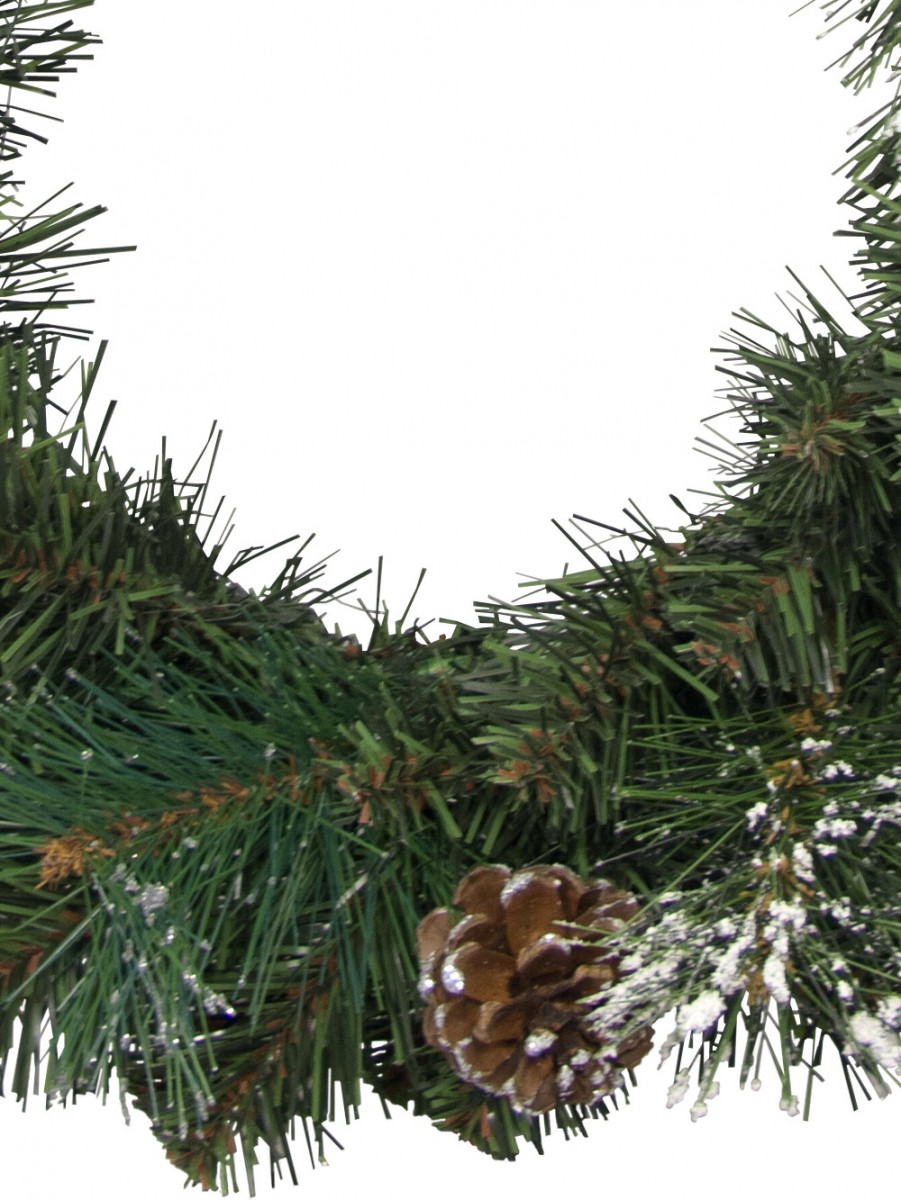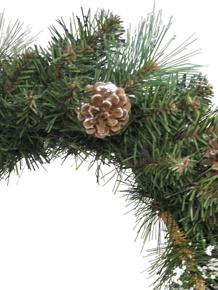 You can welcome guests to your home in a truly personal way when you make your own holiday decorations this season to match your theme or decor perfectly. This 45 cm wreath will provide the perfect base for you to do just that. Flocked and glittered morning frost wreath of pine boughs has 80 distinct tips and is topped with a few silver accented pine cones. Spruce this wreath up with bows, ribbons, holly berries, poinsettias, baubles, candy canes, bells, small ornaments... whatever it takes to bring your creative vision to life! Wreath measures 45 cm x 14 cm x 45 cm.
