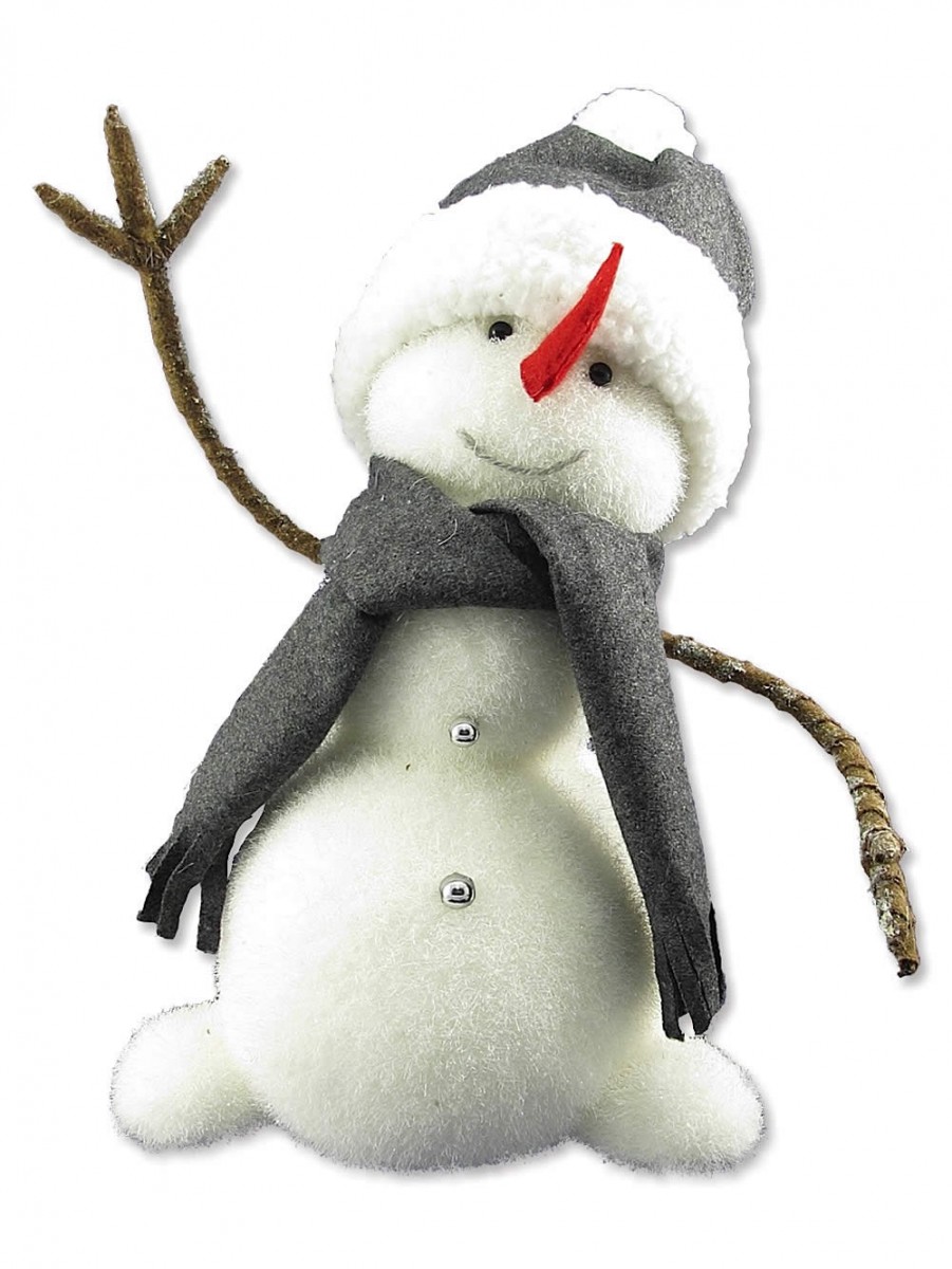 This yuletide accent is made from a combination of flocked Styrofoam and other fine quality materials. It showcases the snowy white and frosted snowman sculpture. The smiling figure is spruced up with the grey coloured scarf and matching grey hat with white trimming. It has two silver buttons in front, red fabric pointy nose and the brown branch like arms.