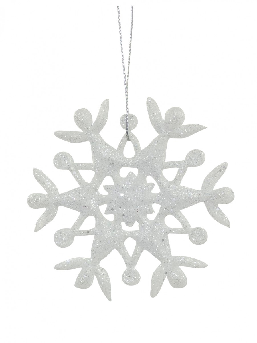A winter wonderland style Christmas ornament for the tree finished in iridescent white glitter. The snowflake is frosted plastic and has silver scattered scents. Featuring six points and a star shaped centre, the snowflake Christmas ornament is 90 cm wide and 90 cm long. Each point is shaped like a little angel adding to the Christmas theme this ornament is meant to portray. The hanging ornament is sold individually and can be shipped worldwide. In addition to this, the frosted, glitter, snowflake ornament has a 100% guaranteed replacement stamp and is guaranteed at a low price.