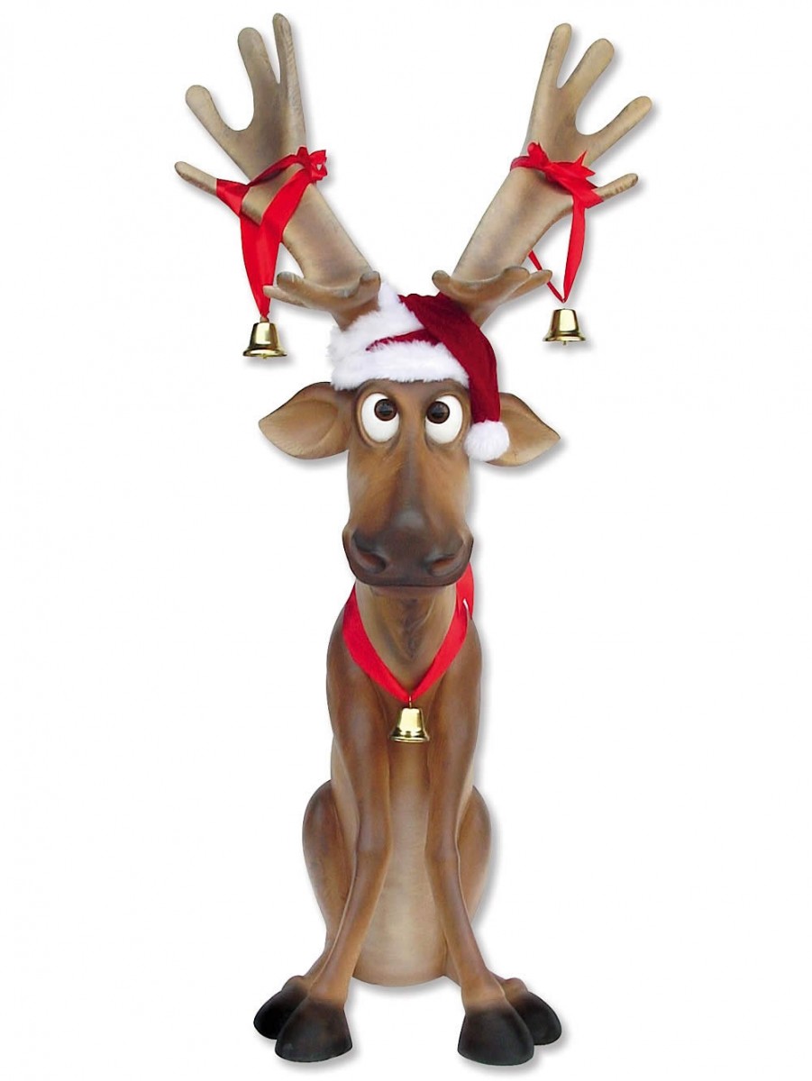 With his Christmas hat, ribbon, bells, bow-legged look and comical facial expression, this funny sitting reindeer is the epitome of fun and playfulness and bound to generate some smile and giggles this Christmas. He (or she!) is made from durable polyresin, and is 280mm x 570mm x 320mm in size. Sturdy and noticeable he'll make a lovely addition to your Christmas decorations, for either inside your home or workplace, or outside where he can entertain passers-by.