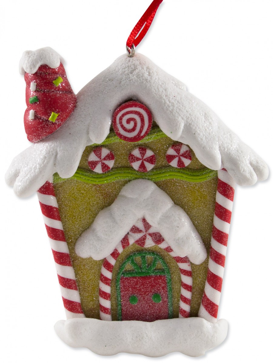 Looks so good you`ll want to take a bite! Forget the boring Christmas decorations that usually grace your home during the holidays. No set of ornaments for your tree would be complete without this yummy-looking hanging ornament. Shaped just like a tiny gingerbread house, its delicious just-baked cookie colour is set off by eye-catching red peppermints and candy canes. The windows and eaves of this adorable ornament are covered with a thick blanket of snowy white "frosting". One look conjures up the delectable tastes and smells of the holiday season!