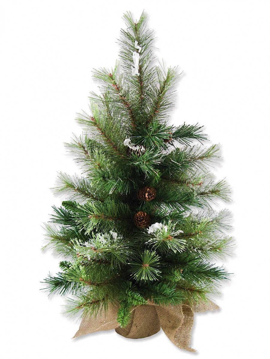 Table top Christmas trees are convenient little bundles of yuletide cheer that can fit upon virtually any free surface in your home or office, and this particular piece is an especially attractive one for the season. It has this white glitter-frosting sprinkled all over the faux pine needles, giving it the appearance of a tree with fresh snow cover all over it. It even has a few pine cones snuggled into the branches, adding a much more authentic Christmas feel to it. The tree itself stands 65cm high by 40cm wide, allowing it to fit well into small spaces like desk tops or coffee tables. It comes with a burlap bag to give it a more attractive and authentic look, and its plastic composition means you can just pack it away once the holidays are over and bring it out for next Christmas all nice and shiny and ready to cheer up your home. A few bits and baubles would, of course, go very well with this small table top tree. We have a wide selection of items in our catalogue, so feel free to browse and pick out what would best match your Christmas decorations!