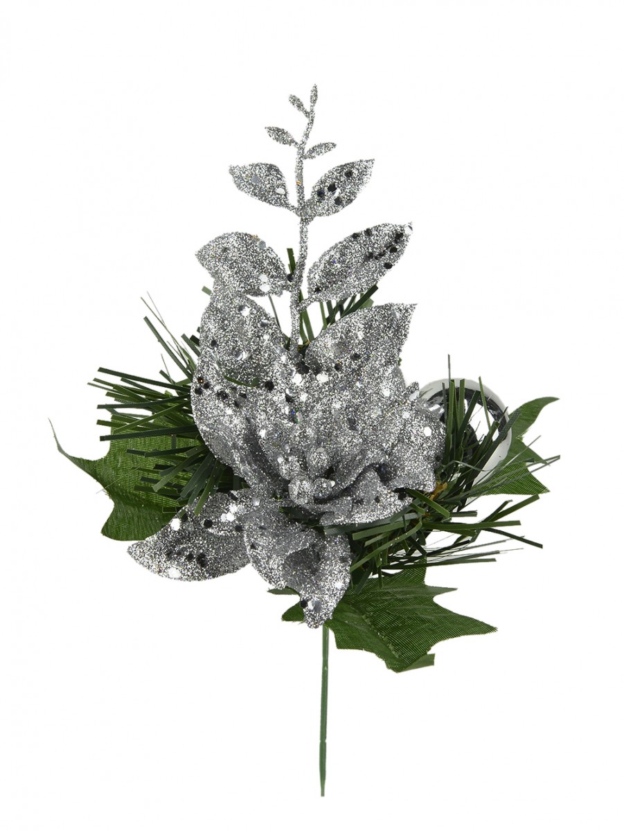 Glittered silver poinsettia pick with chocolate glittered leaves & green foliage