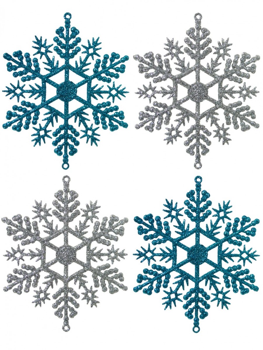 Bring snow to your tree with a pack of four snowflakes. These snowflakes are artfully coloured in turquoise and sliver and then glittered. The way that the glitter glistens in the lights of your Christmas tree will remind you of how the snow glistens in the snow. They are sized at ten cm to blend flawlessly with the other decorations on your tree. You can use them alone or in combination with other packages to give your Christmas tree the exact look that you want with a minimal amount of effort. Begin a new tradition with your family.