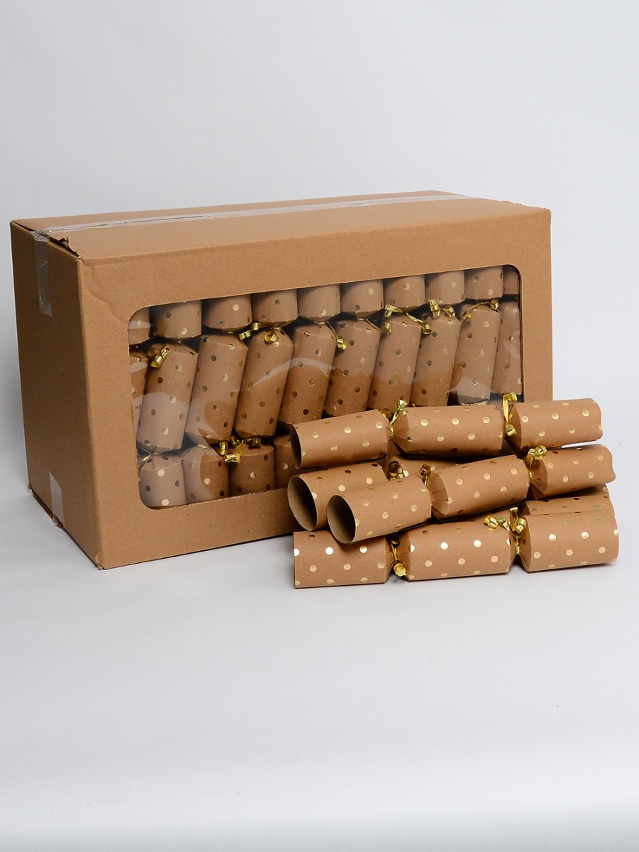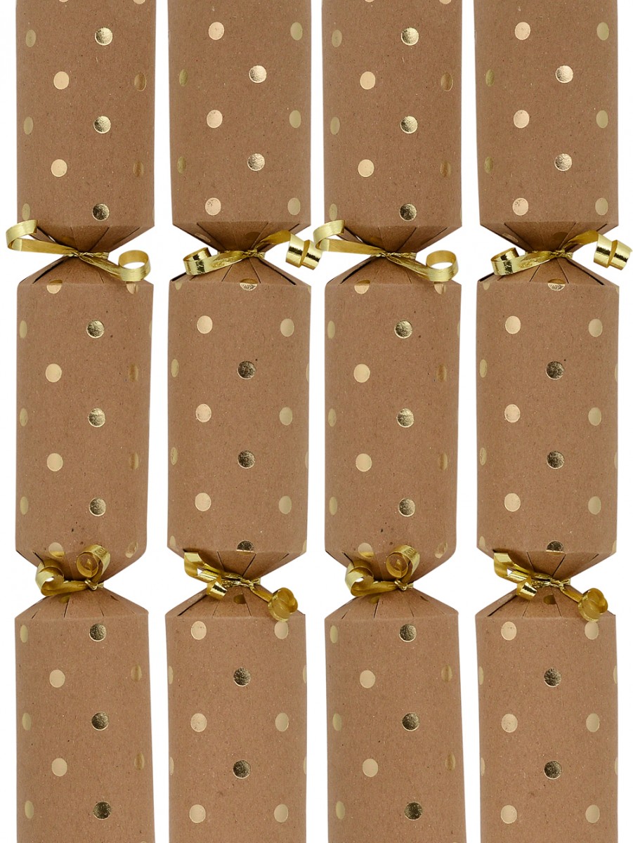 Each bonbon features a delightful snap, a surprise gift, a festive hat, and a playful joke, making them a true embodiment of the holiday spirit. Whether you place them on your Christmas table as decorative accents or share them with your loved ones during a festive gathering, these bonbons are guaranteed to bring joy and excitement to the occasion. The gold dot pattern design on kraft paper adds glamour to these bonbons. When paired with Christmas trees and ambient lights, they create a visually stunning and captivating display that is full of texture. Let them make a bold statement as they adorn your fireplace mantel and nestle under the Christmas tree, welcoming your loved ones to a warm and festive atmosphere.